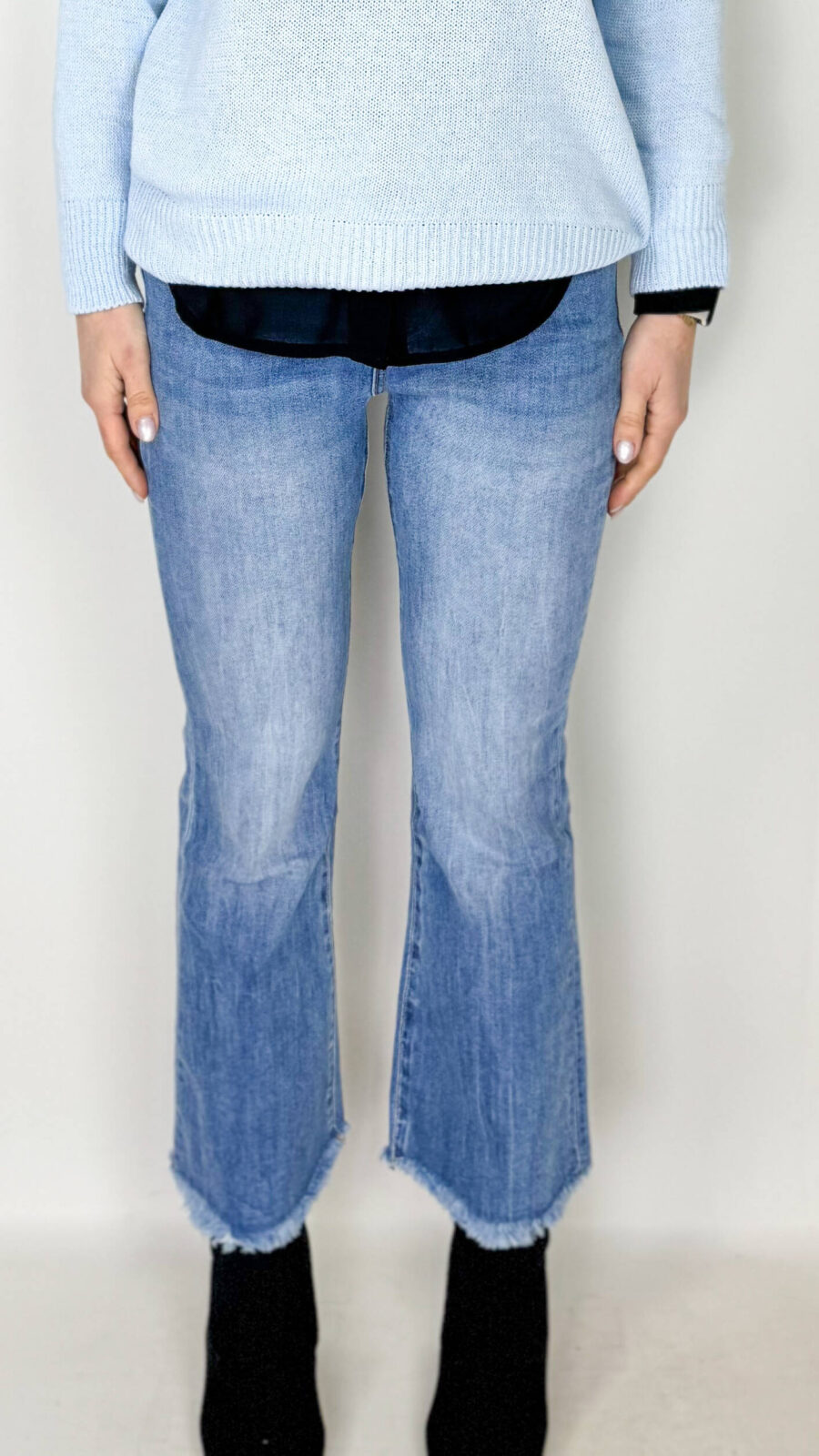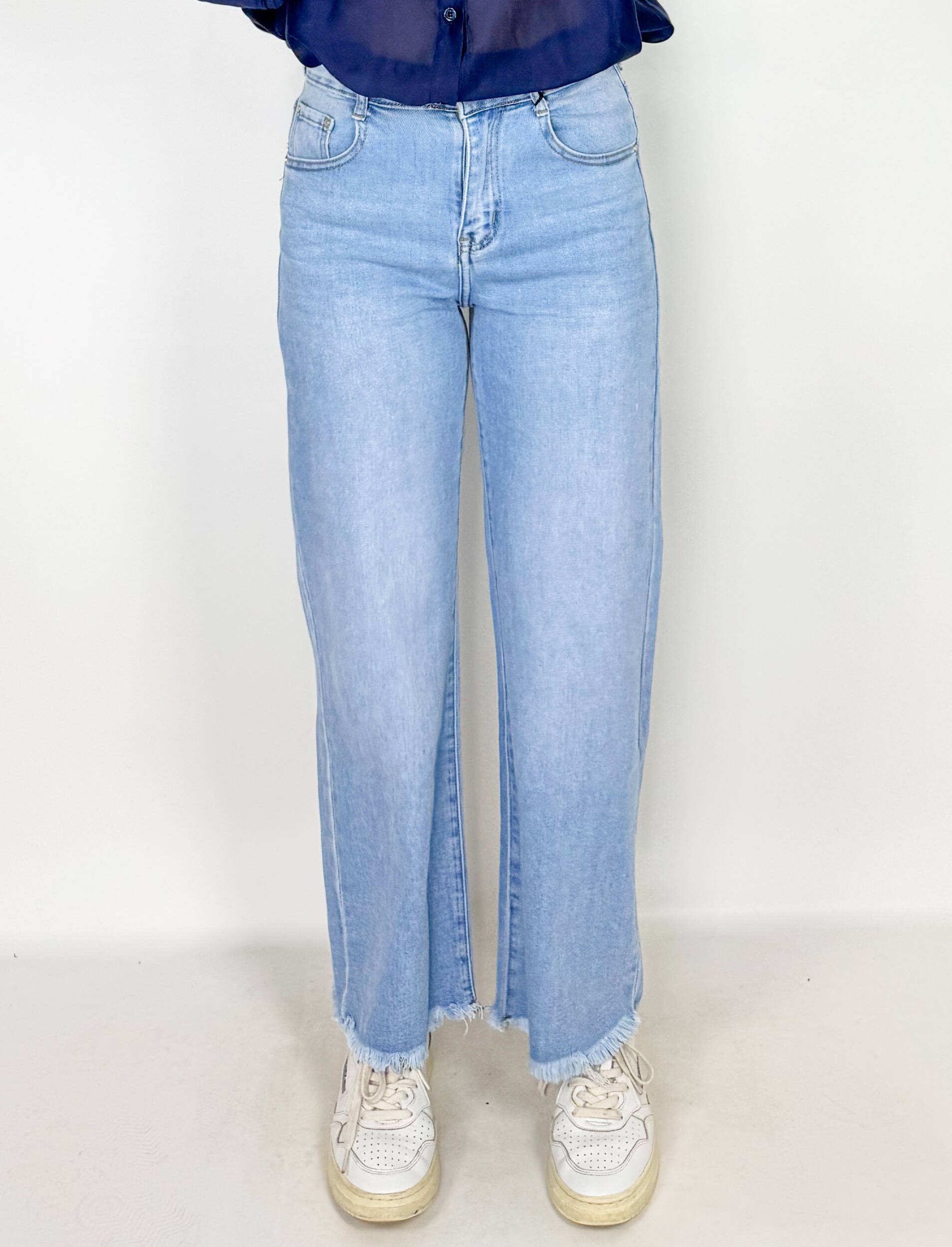 Jeans denim chiaro modello a taglio dritto, sfrangiati sul fondo. Con tasche. Chiusi con zip e bottone.