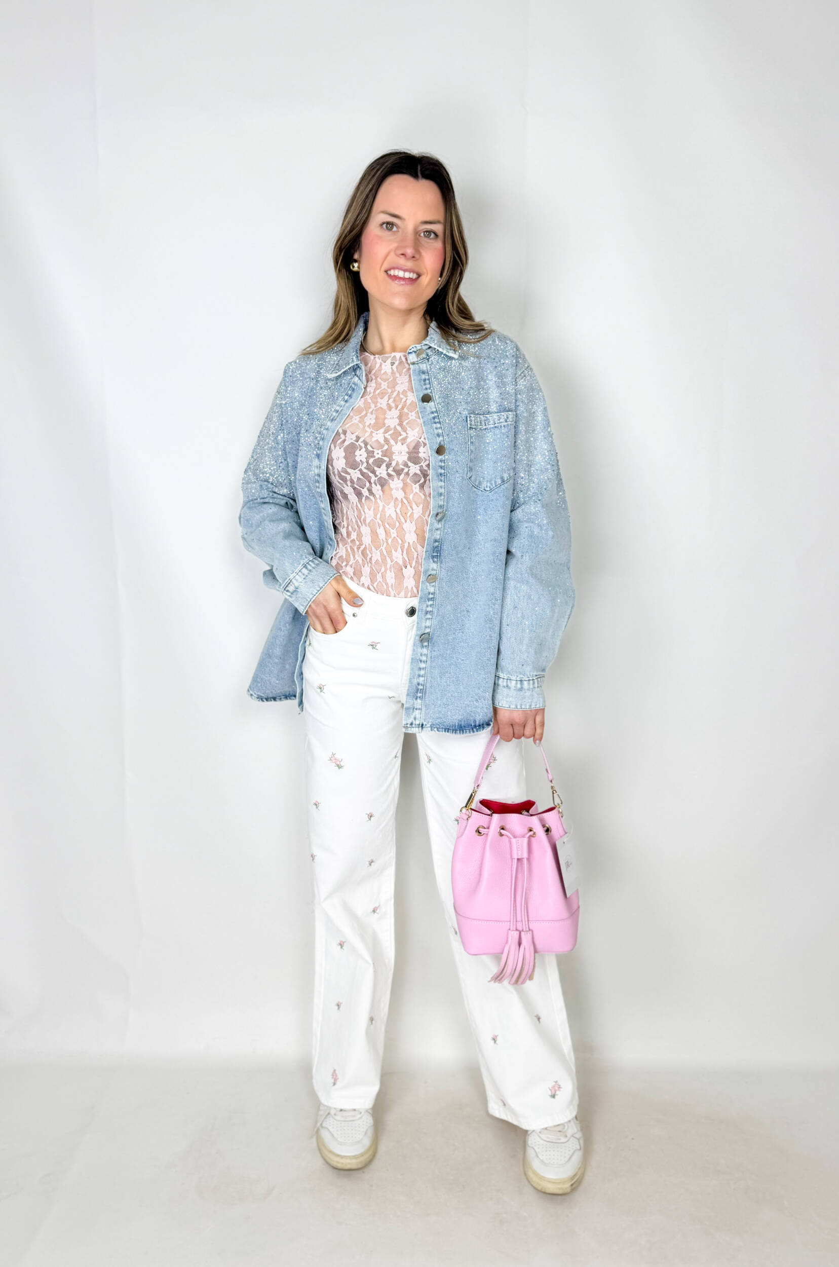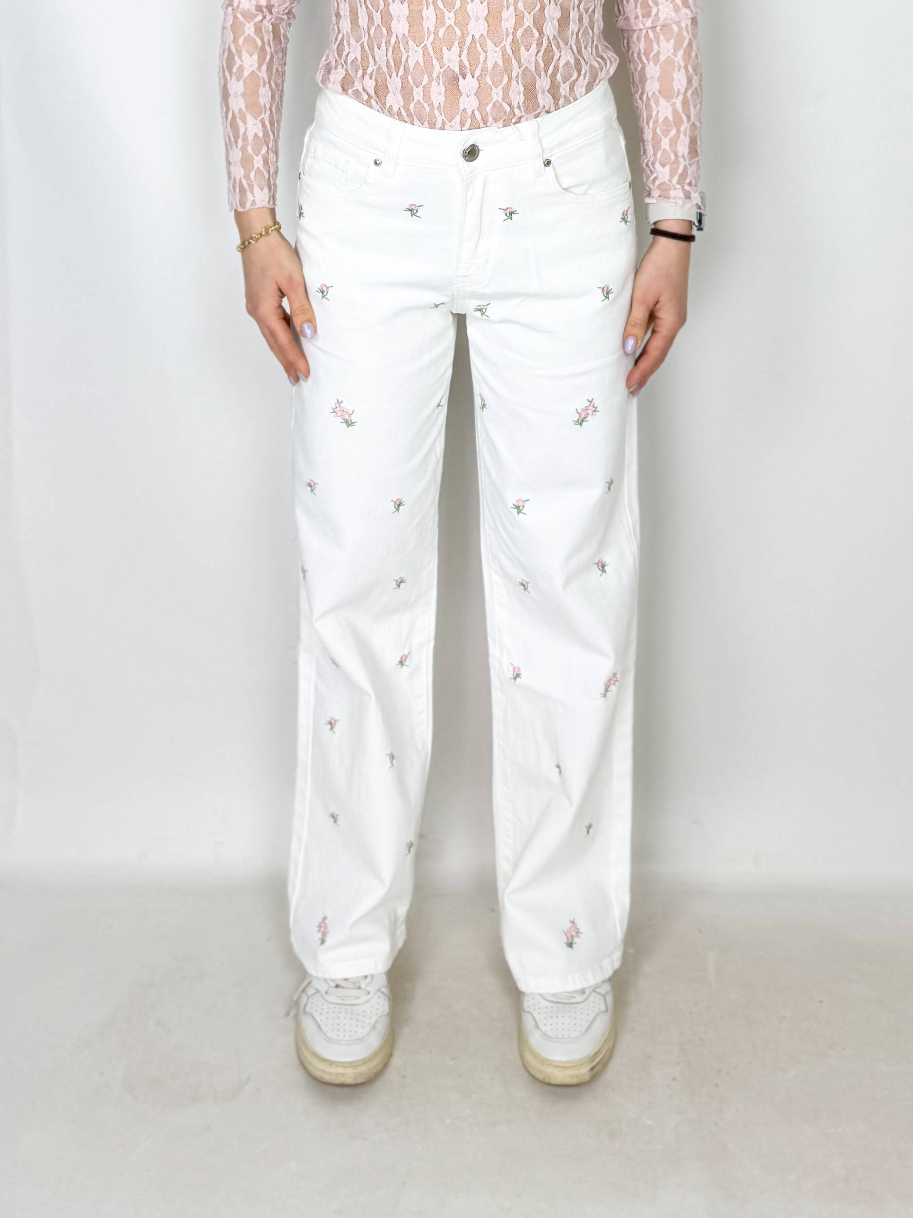 Aggiungi un tocco romantico e luminoso al tuo guardaroba con questi jeans bianchi a gamba dritta, perfetti per la stagione primavera-estate. Il design essenziale viene valorizzato da delicati ricami a fiorellini, che donano al capo un’allure femminile e raffinata.