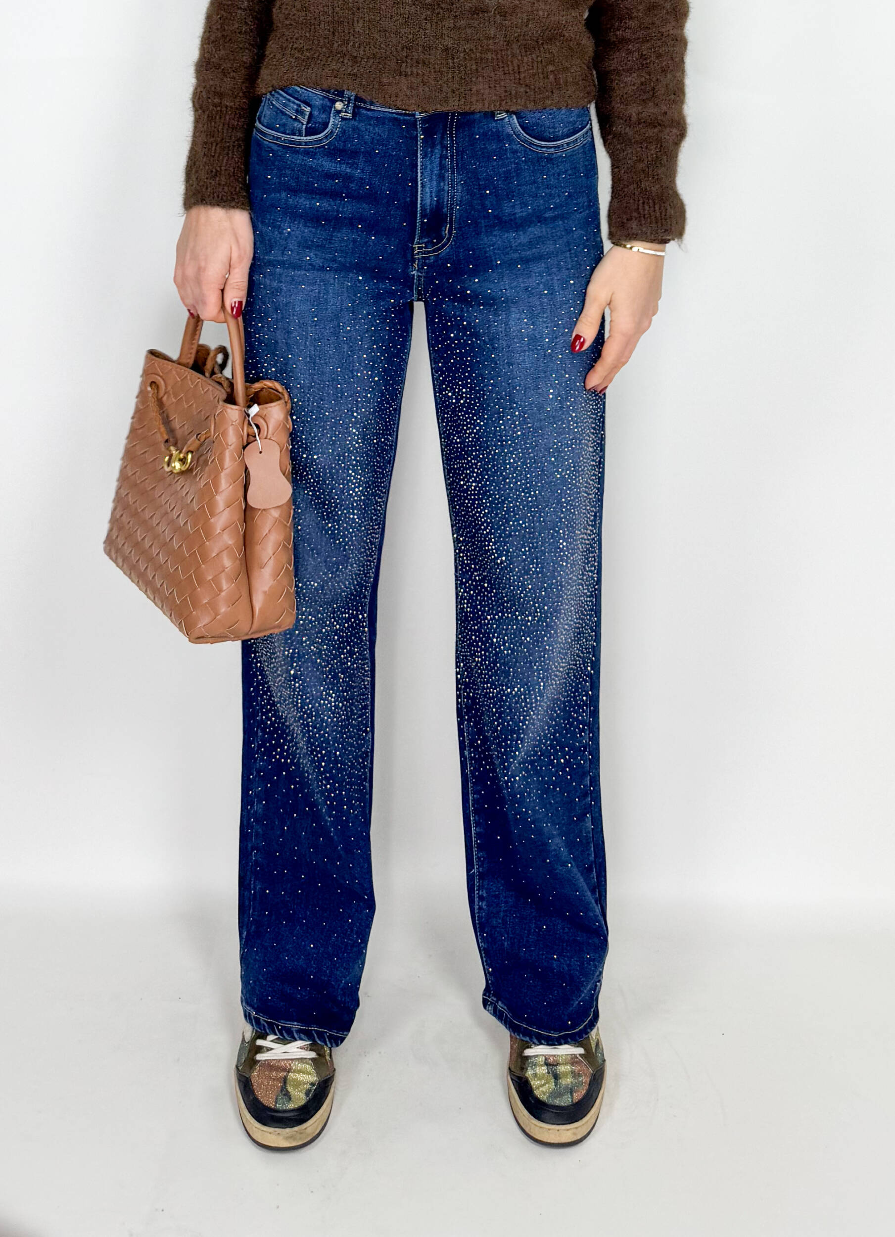 Jeans strass luminoso e chic, modello a gamba dritta in comodo tessuto elasticizzato. Chiusura con zip e bottone. Con passanti per cintura.