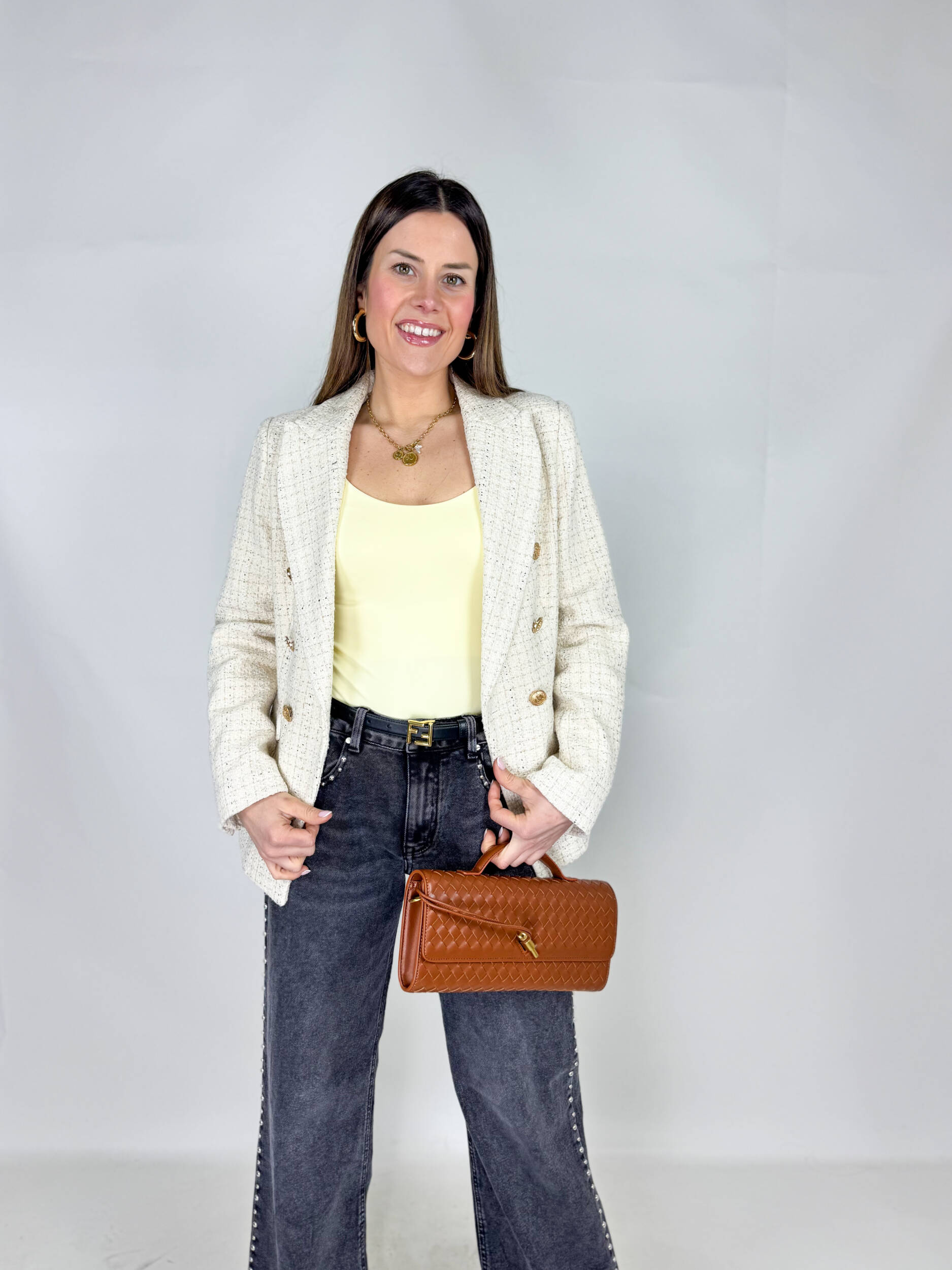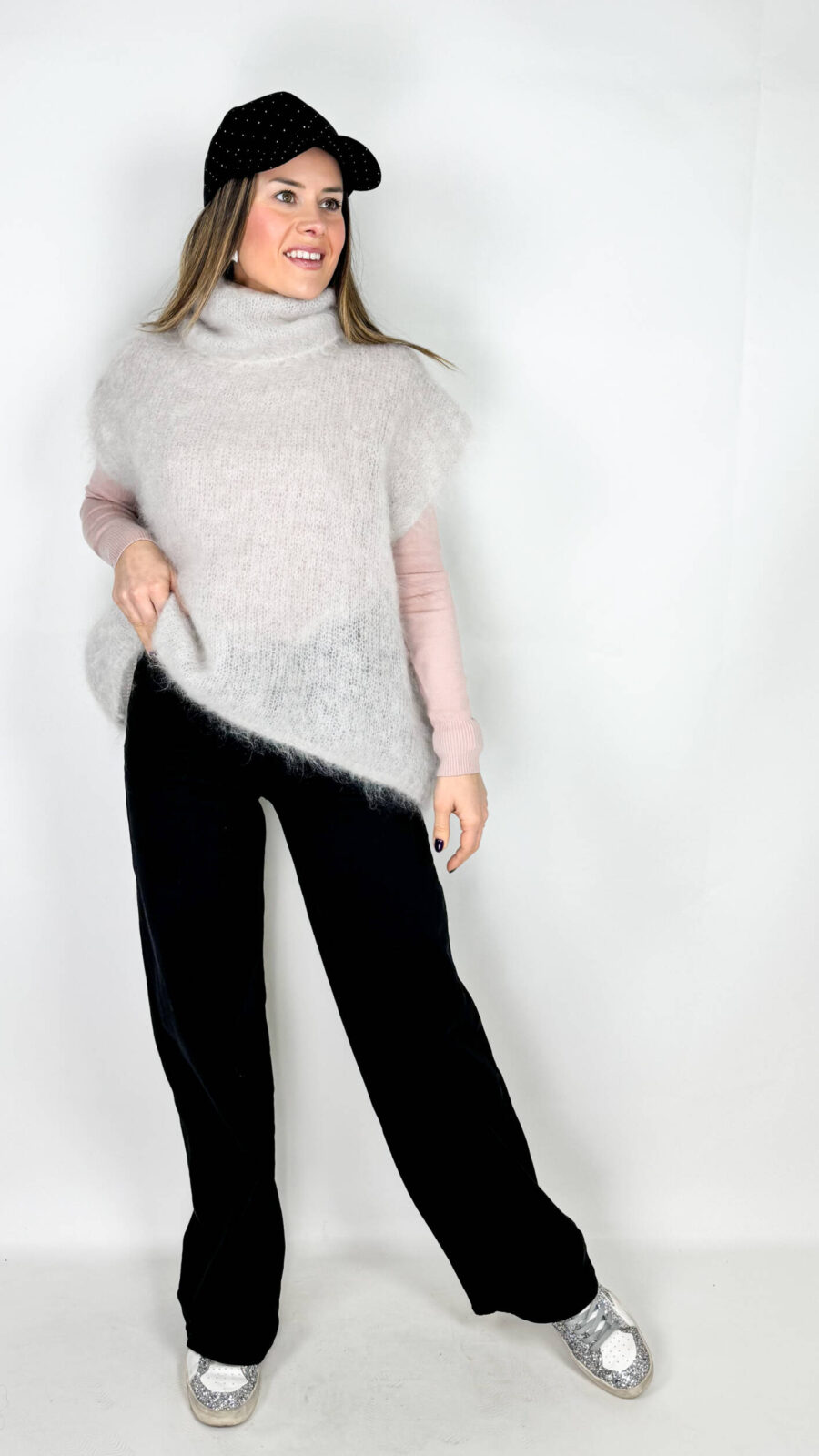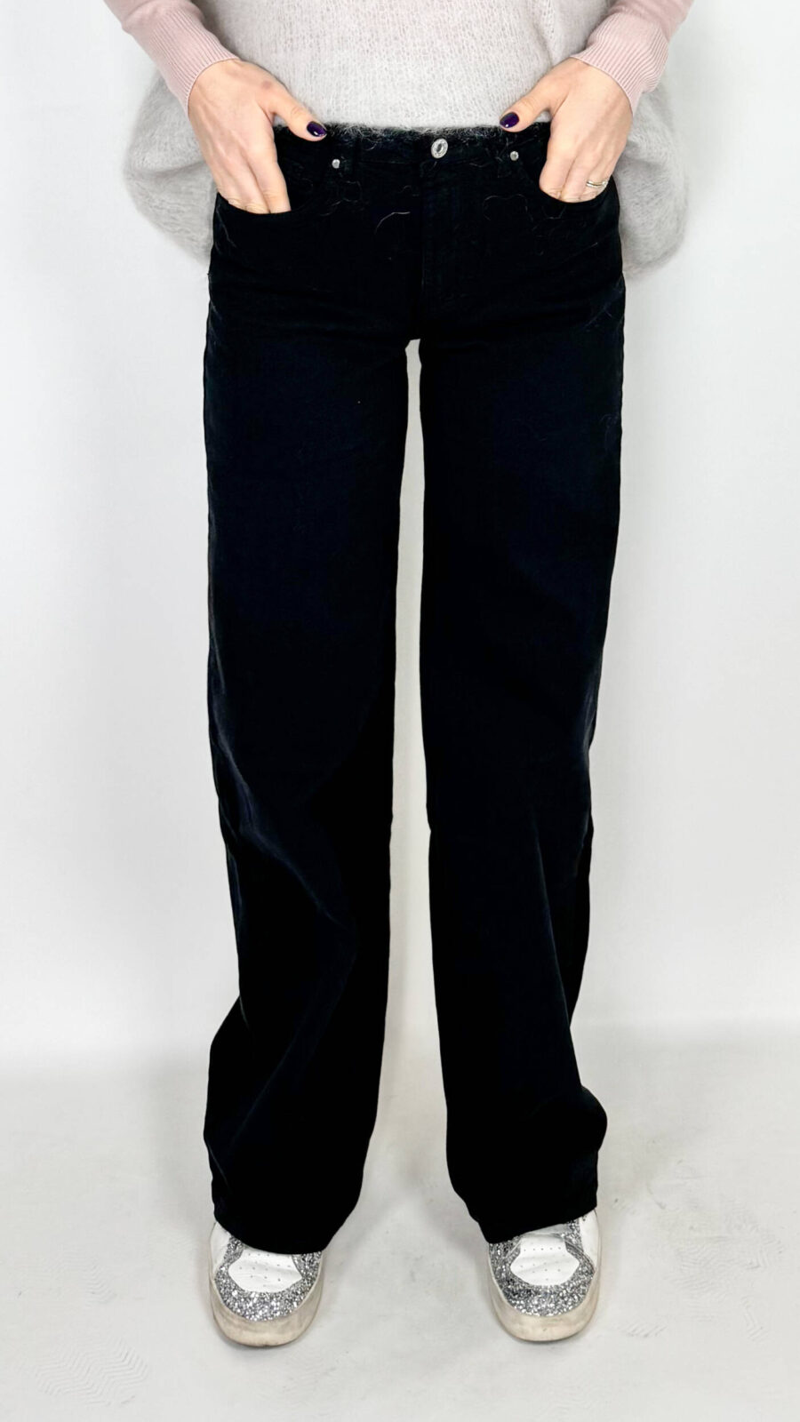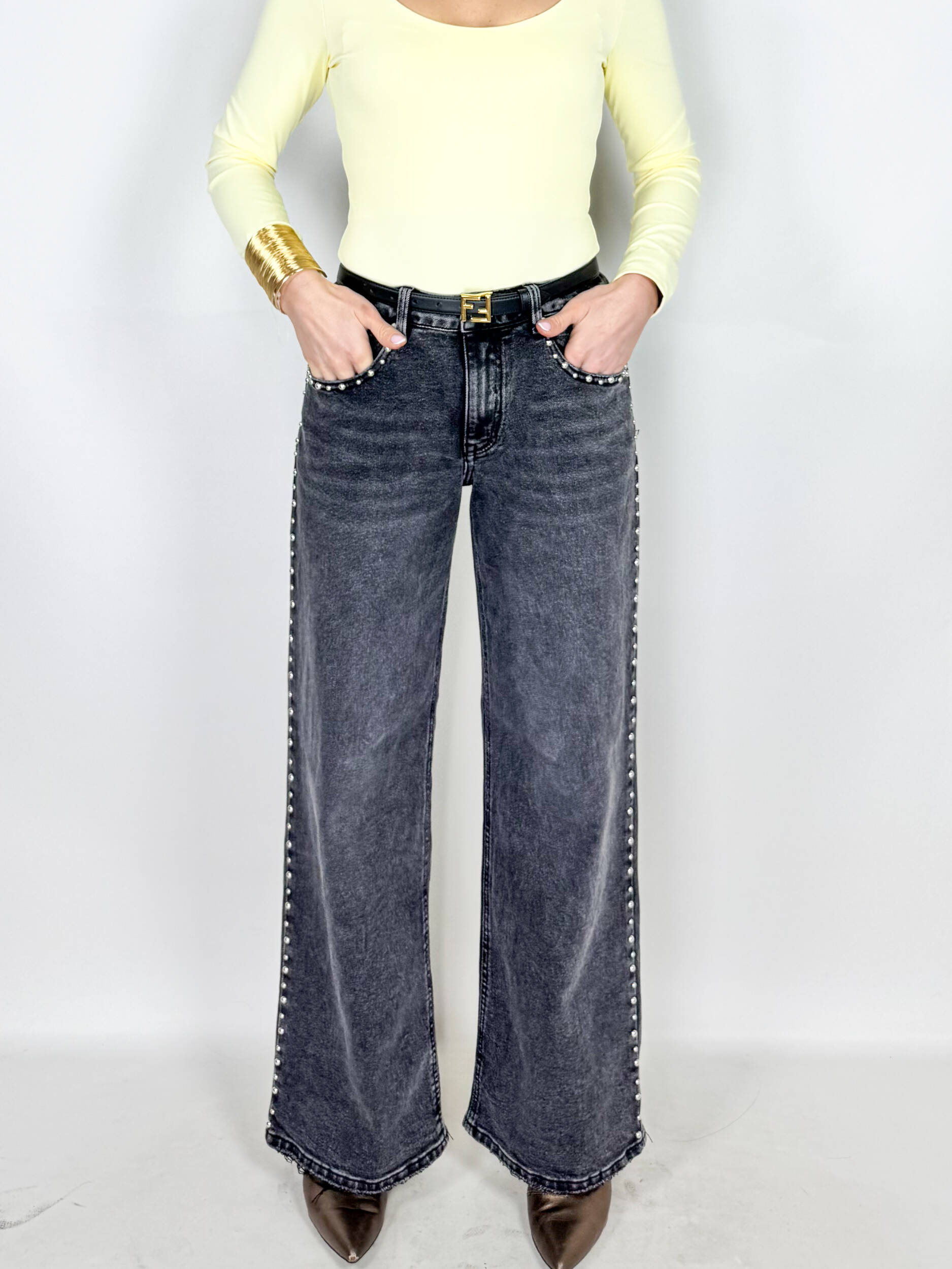 Jeans Style dal grintoso color nero slavato. Modello a palazzo con borchie applicate sui profili. Cotone elasticizzato e comodo. Ideali per chi cerca un jeans scuro ma diverso dal solito.