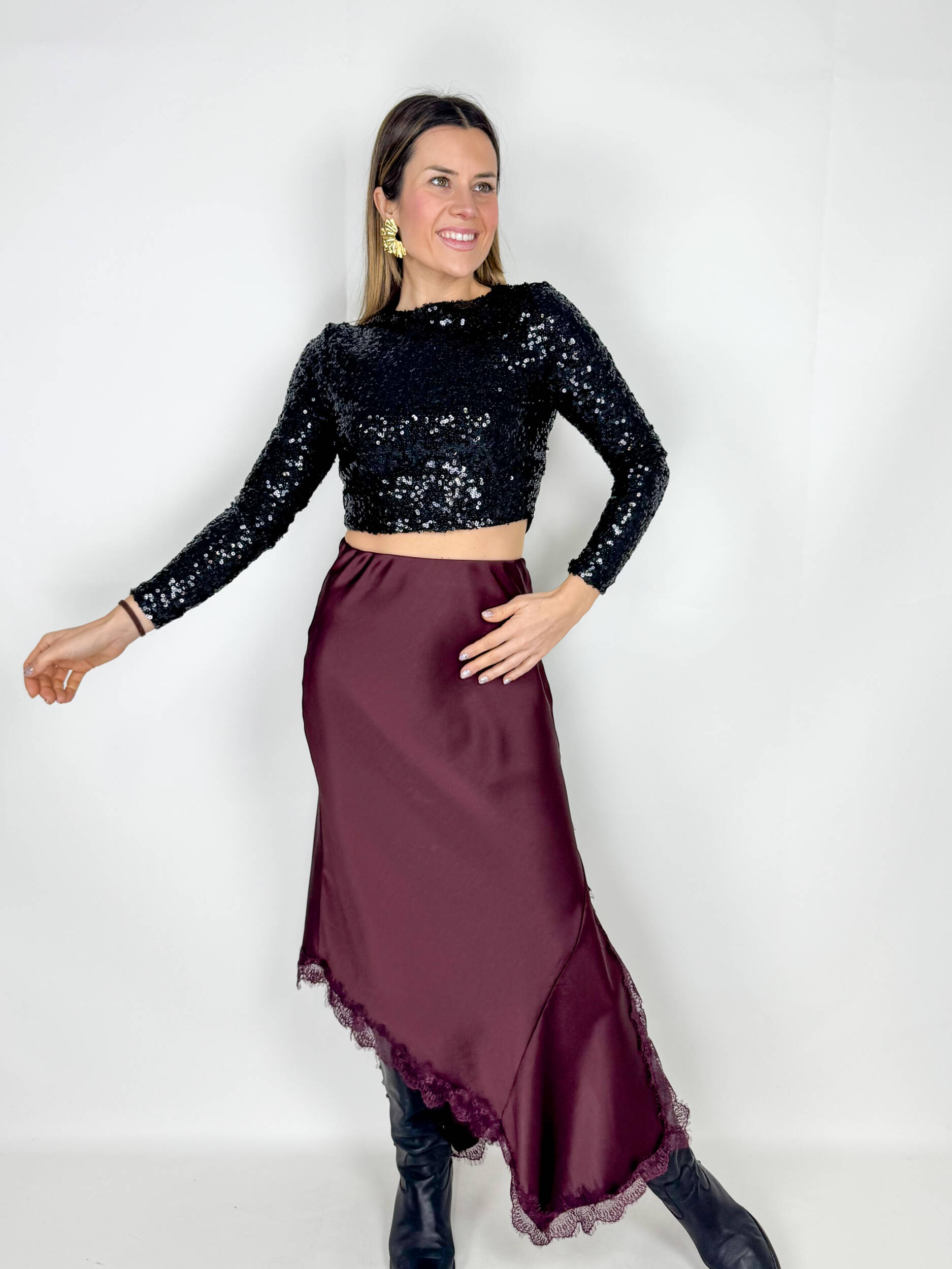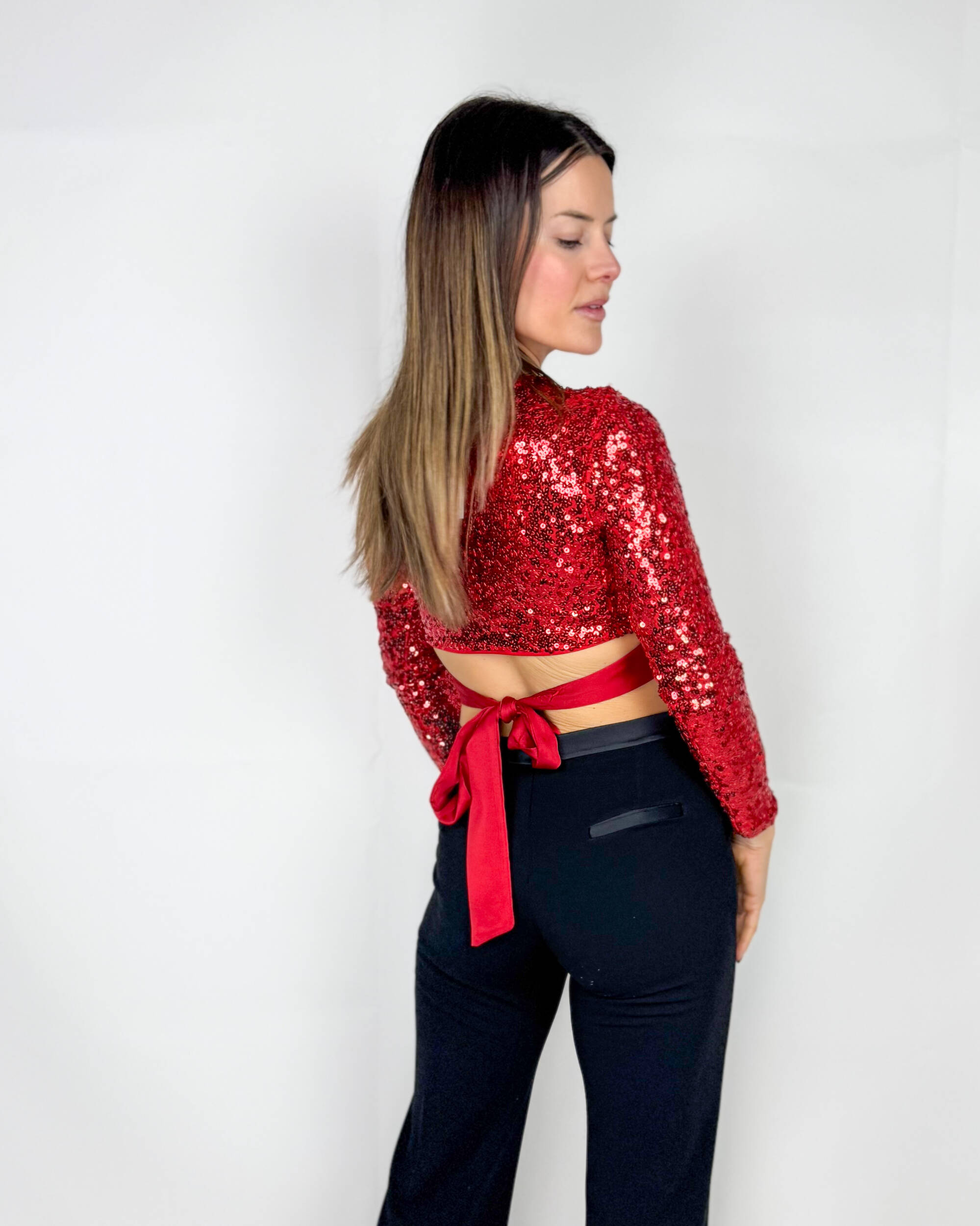 Maglia Luz modello crop in pailettes, girocollo con fiocco in raso sulla schiena. Ideale per le festività natalizie o per outfit serali.