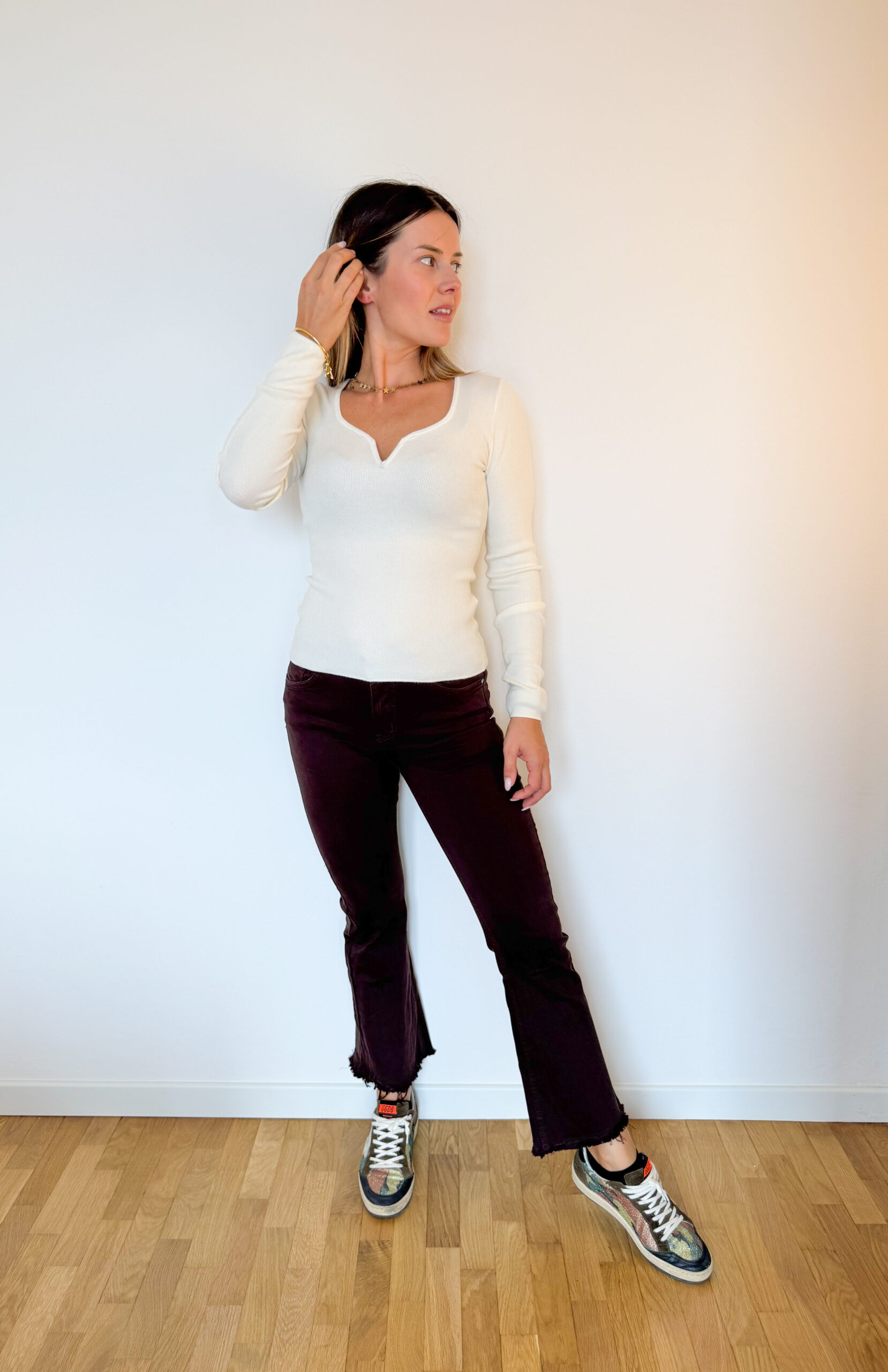 Maglia Sara a costine scollata a cuore sul davanti, manica lunga.