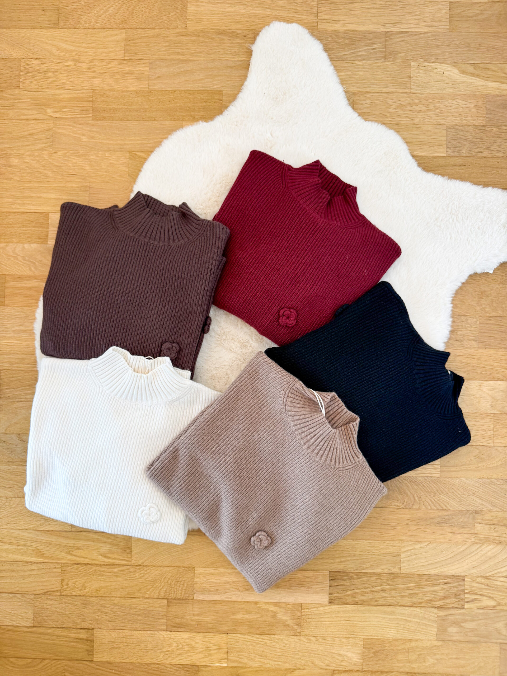 Maglione Fiorellini con collo a lupetto e fiorellini applicati in rilievo. Modello crop.