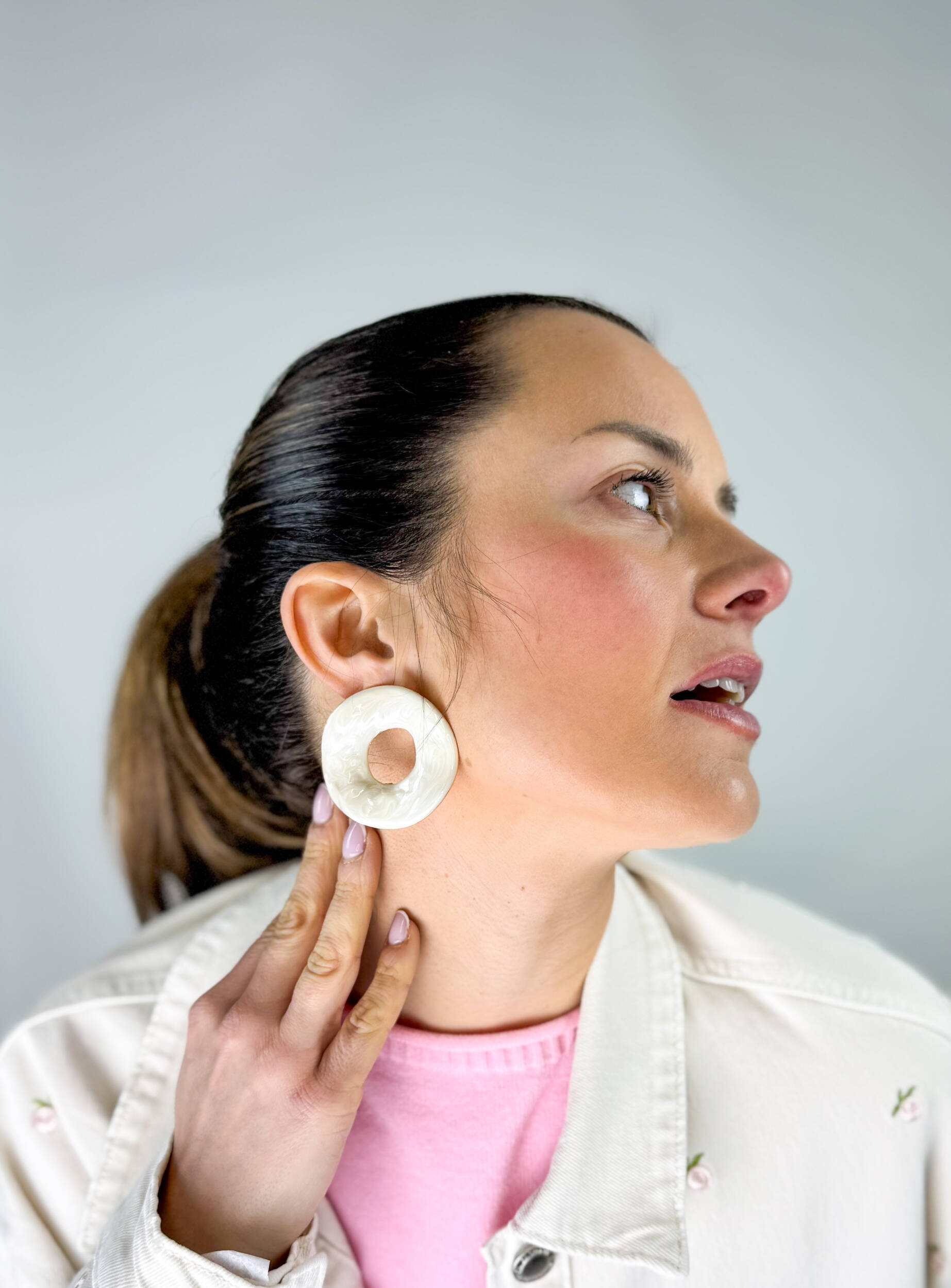 Orecchini Malaga tondi effetto madreperla con base dorata. Anallergici e in acciaio inossidabile, non arrugginiscono.