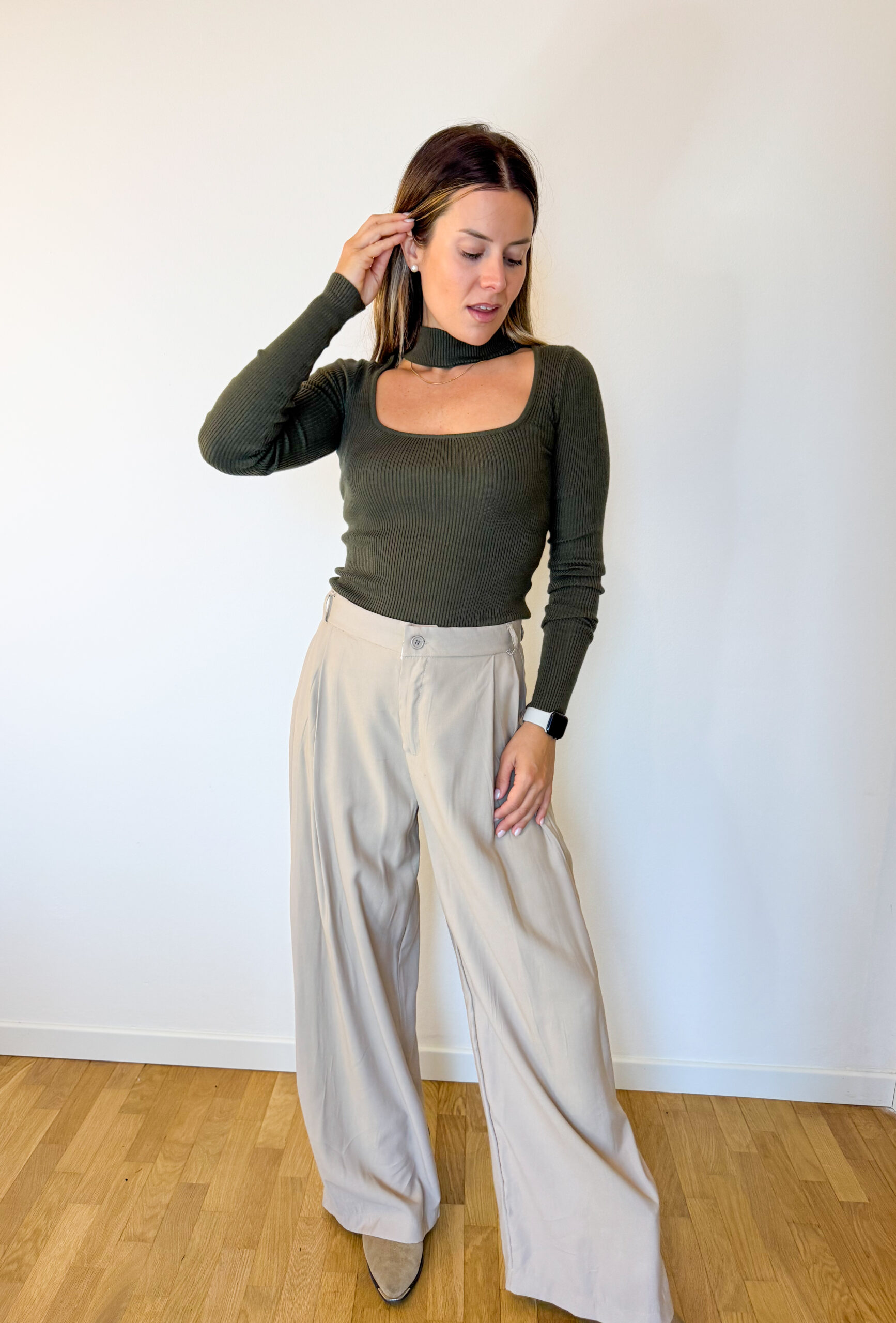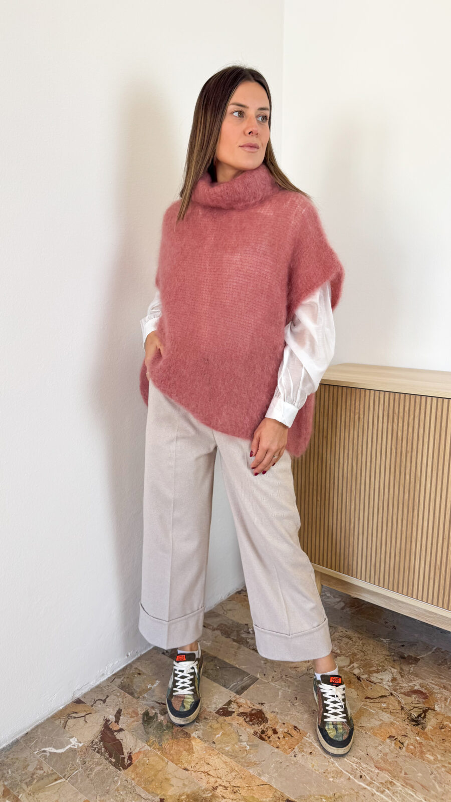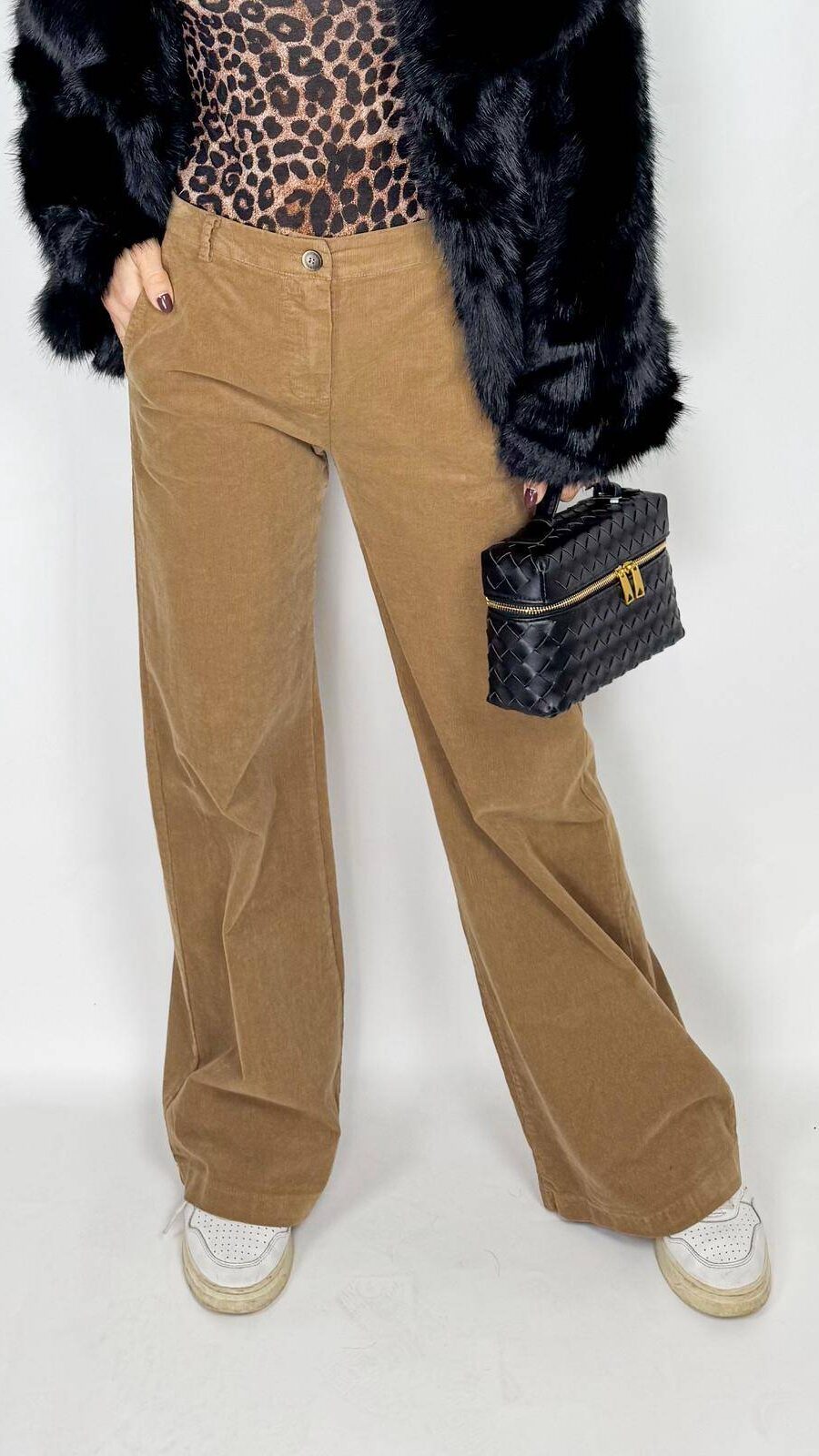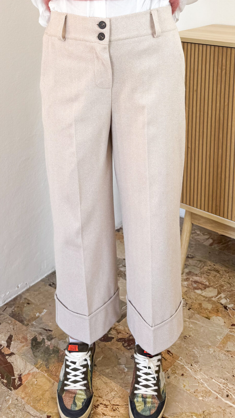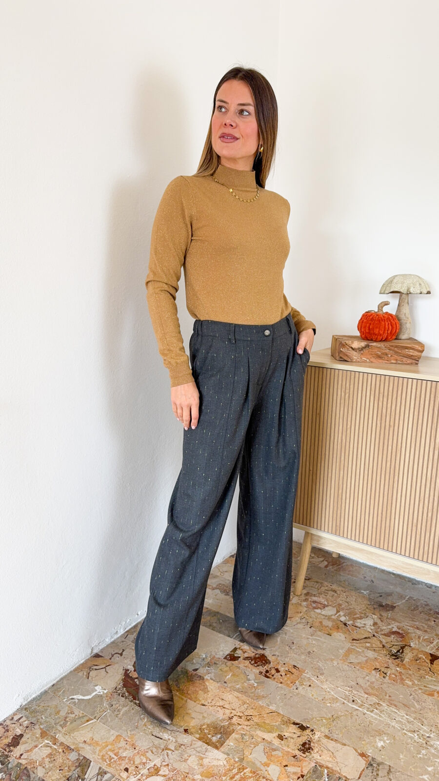 Pantaloni sartoriali con pence in vita a palazzo. Chiusura con gancetto e zip in vita. Con passanti per cintura.