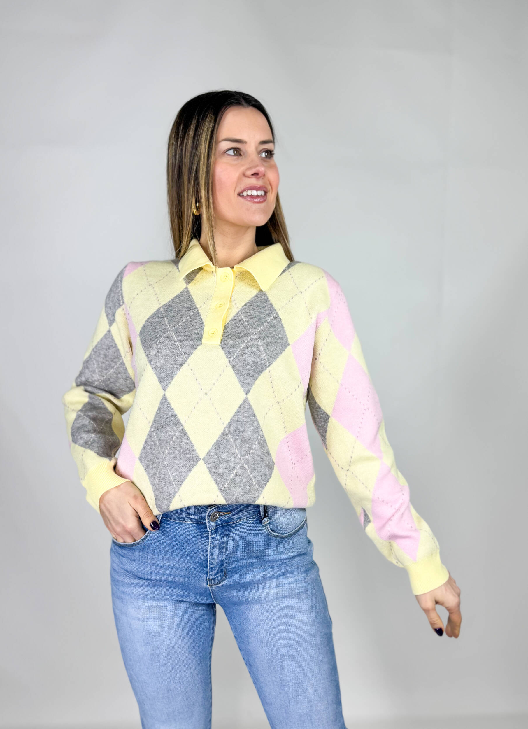 Polo Babi in fantasia Argyle a rombi multicolore. Collo a camicia e bottoncini sul davanti. Arricchisce il tuo guardaroba senza stravolgerlo. Bello da tempo libero o da ufficio.