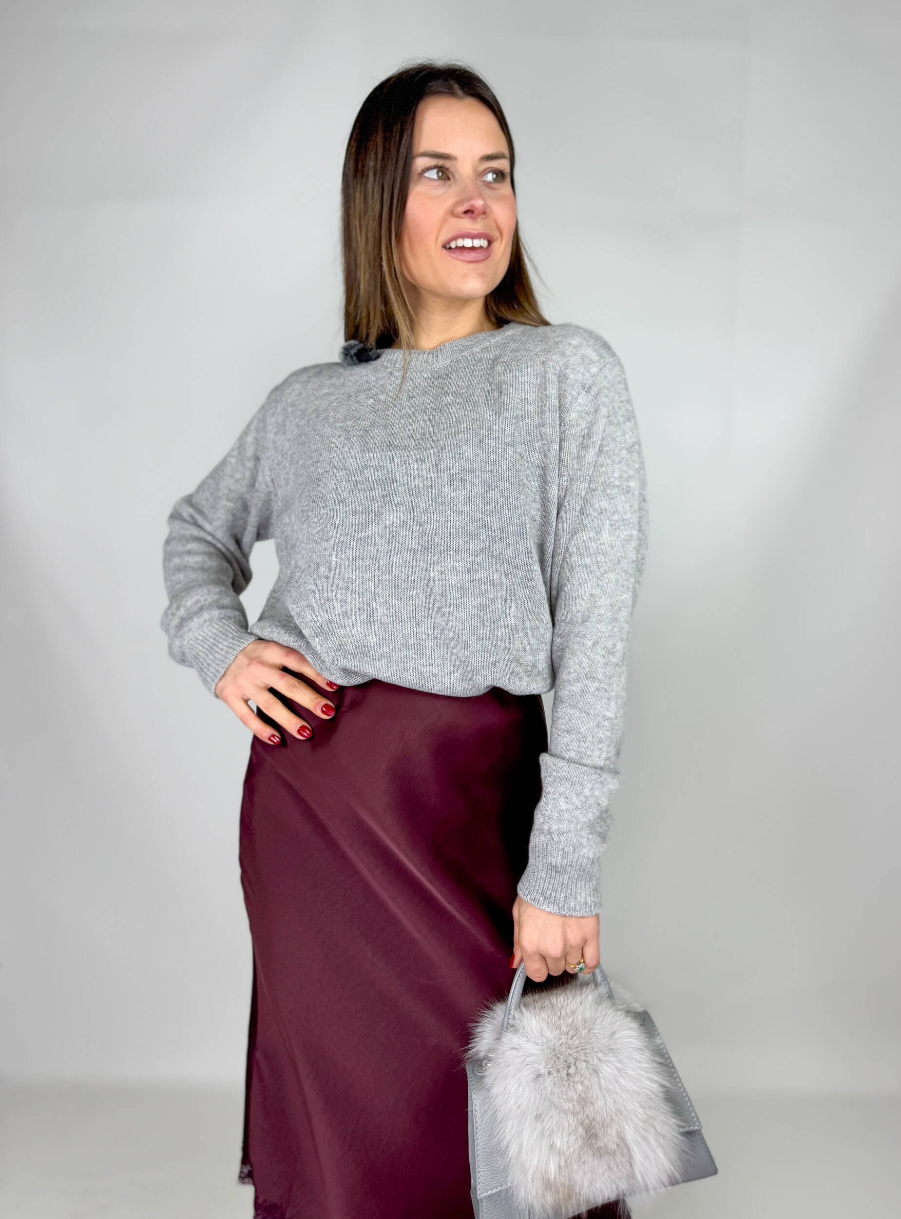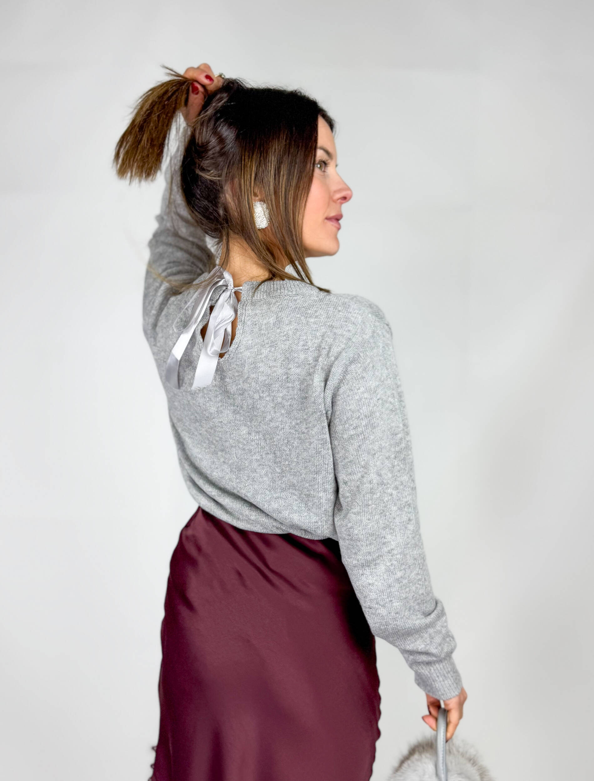 Pullover Giulia girocollo in calda e morbida maglia con fiocchetto in raso regolabile.