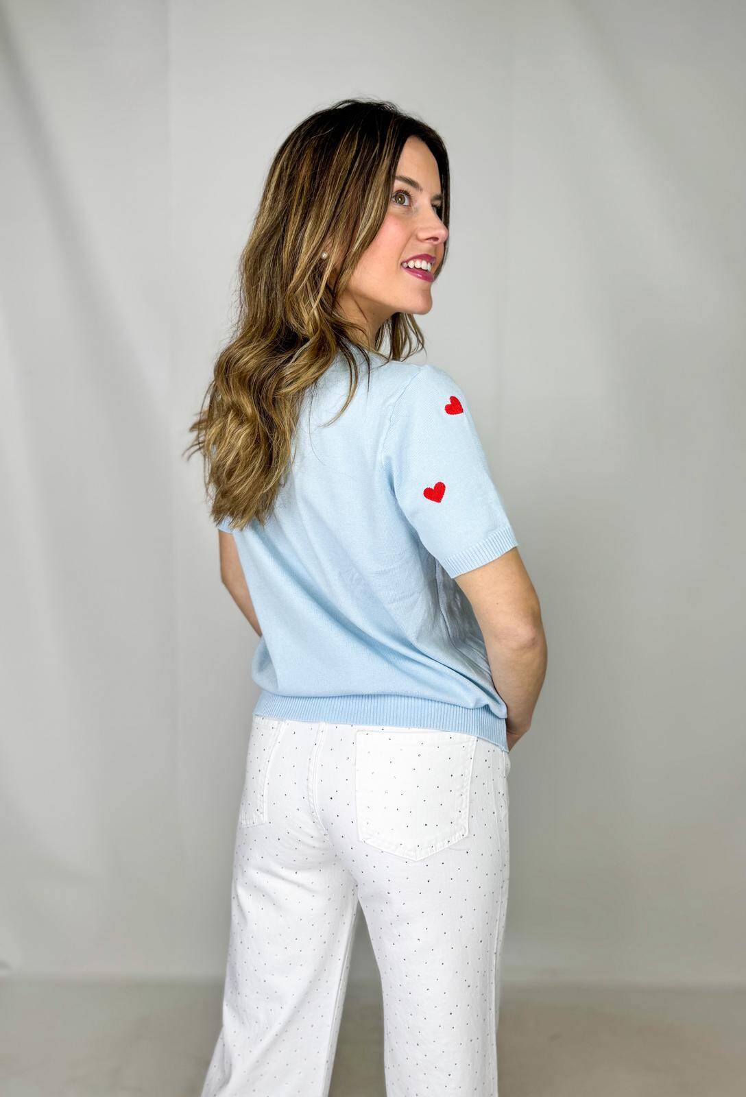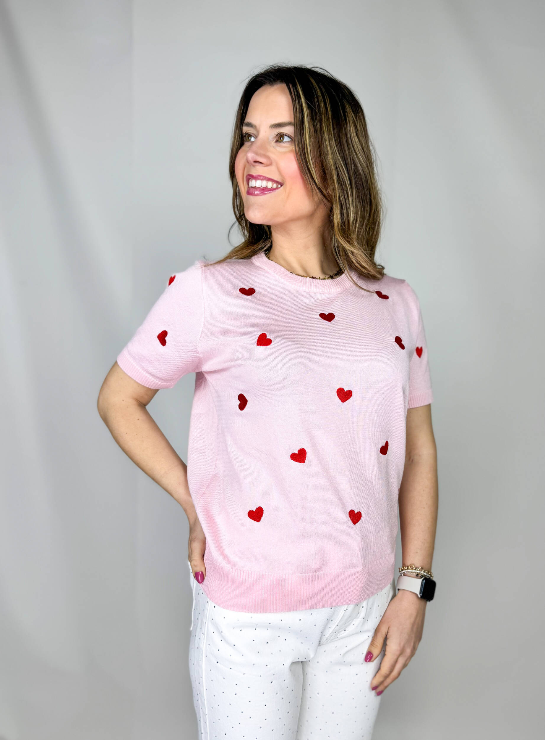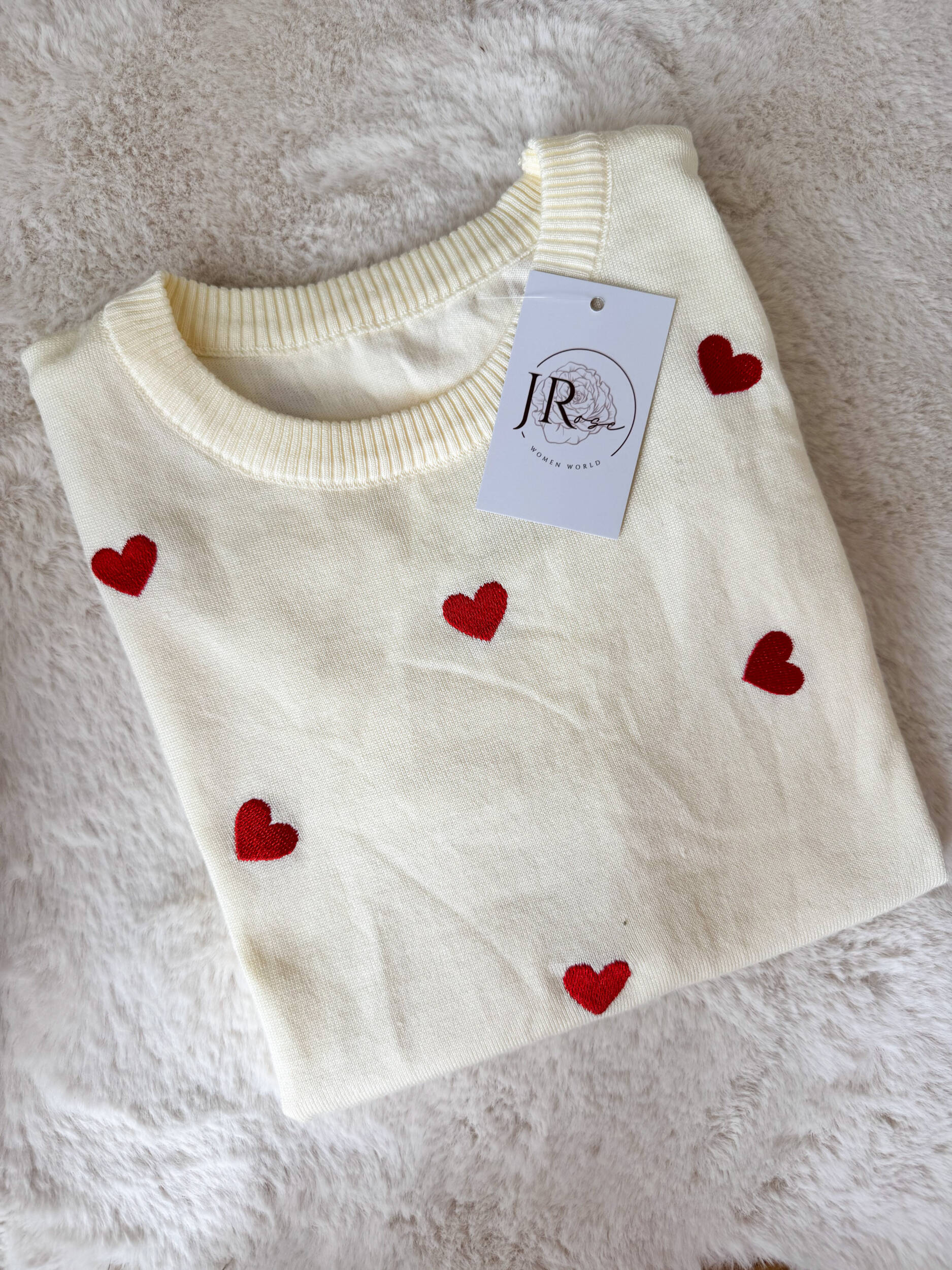 Pullover Lady girocollo in 100% viscosa, leggero e morbido al tatto, ideale per un comfort quotidiano con un tocco femminile. Il modello a manica corta è impreziosito da delicati cuori rossi ricamati, che aggiungono un dettaglio romantico e vivace al capo. La lavorazione a costine sul fondo garantisce una vestibilità stabile e leggermente aderente.
