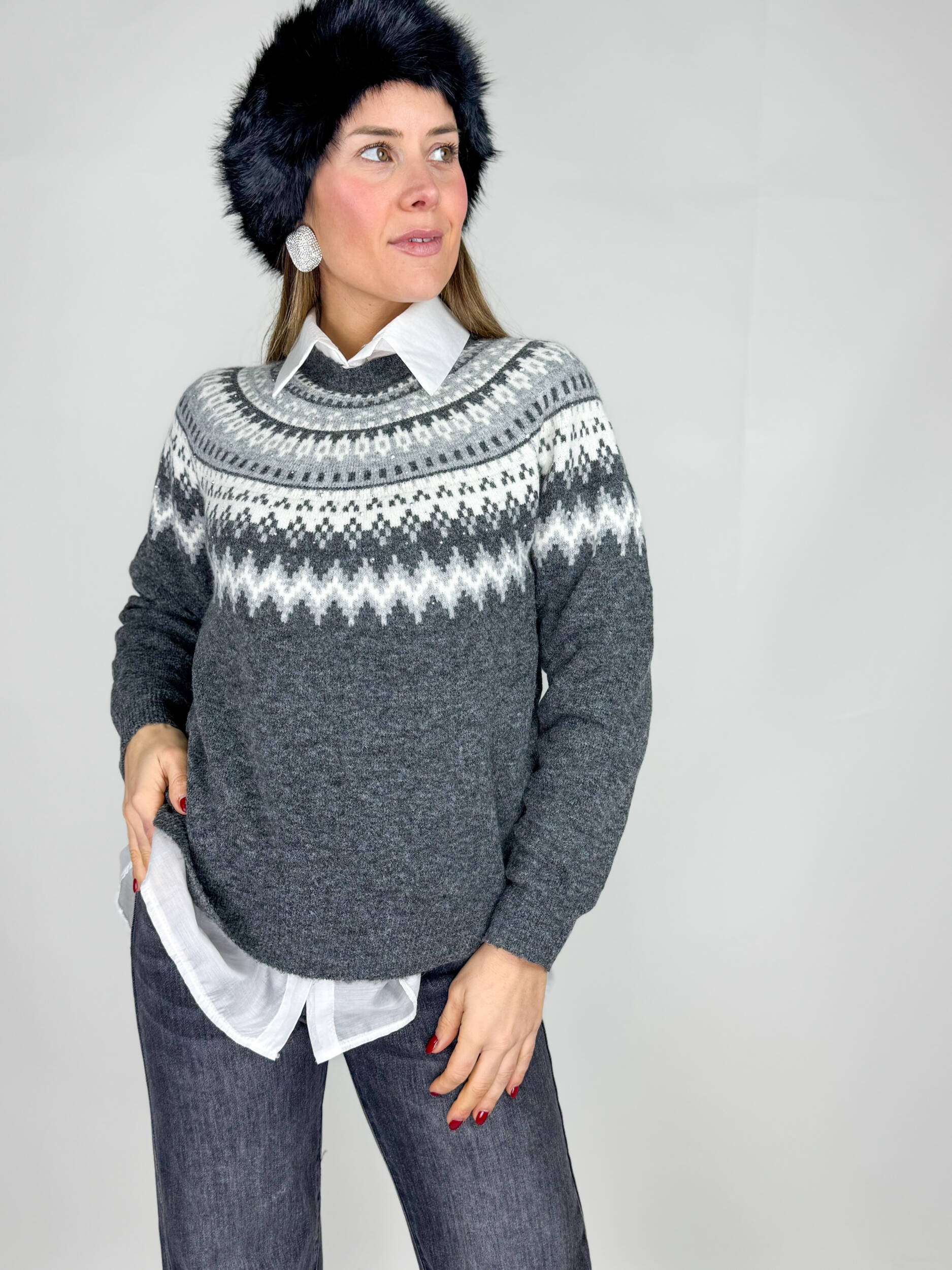Pullover Mountain modello girocollo in fantasia con strass applicati. Morbida maglia invernale.