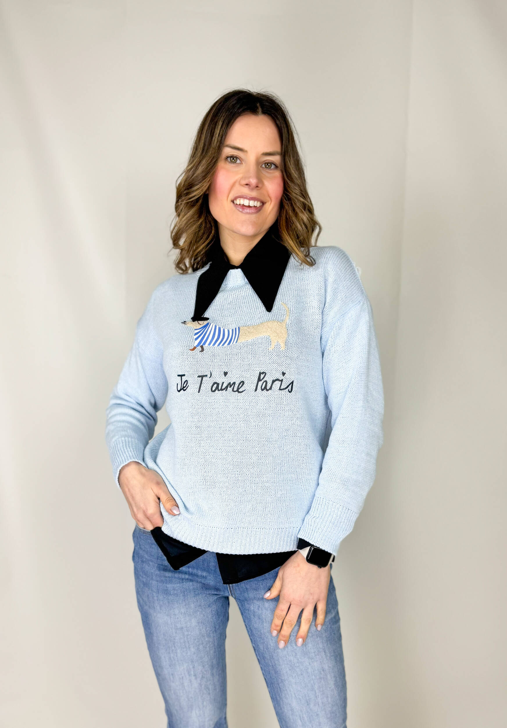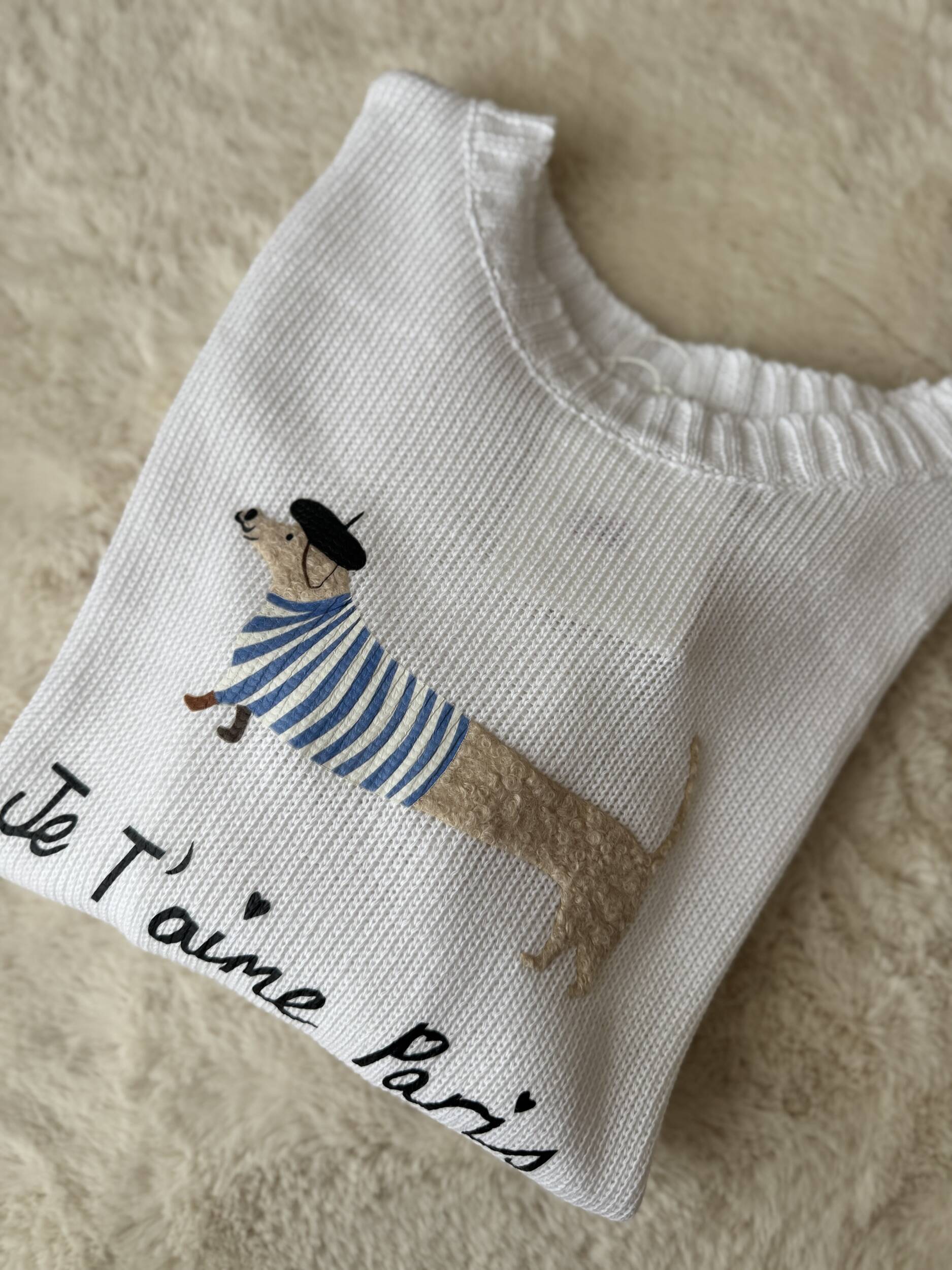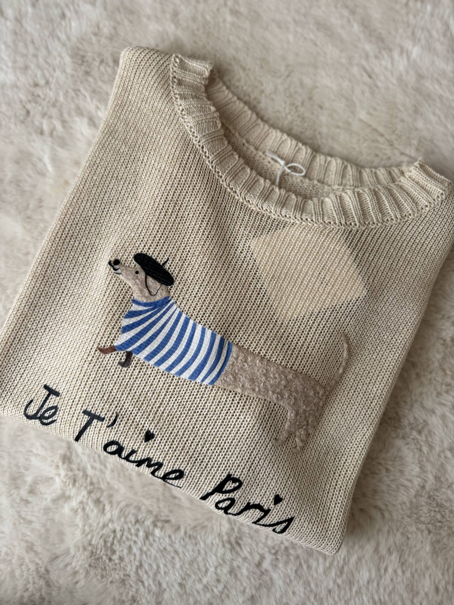 Dolce e divertente, questo pullover in 100% cotone unisce comfort e stile quotidiano. Il motivo del bassotto parigino sul petto aggiunge un tocco giocoso e originale, perfetto per chi ama dettagli unici e ironici.