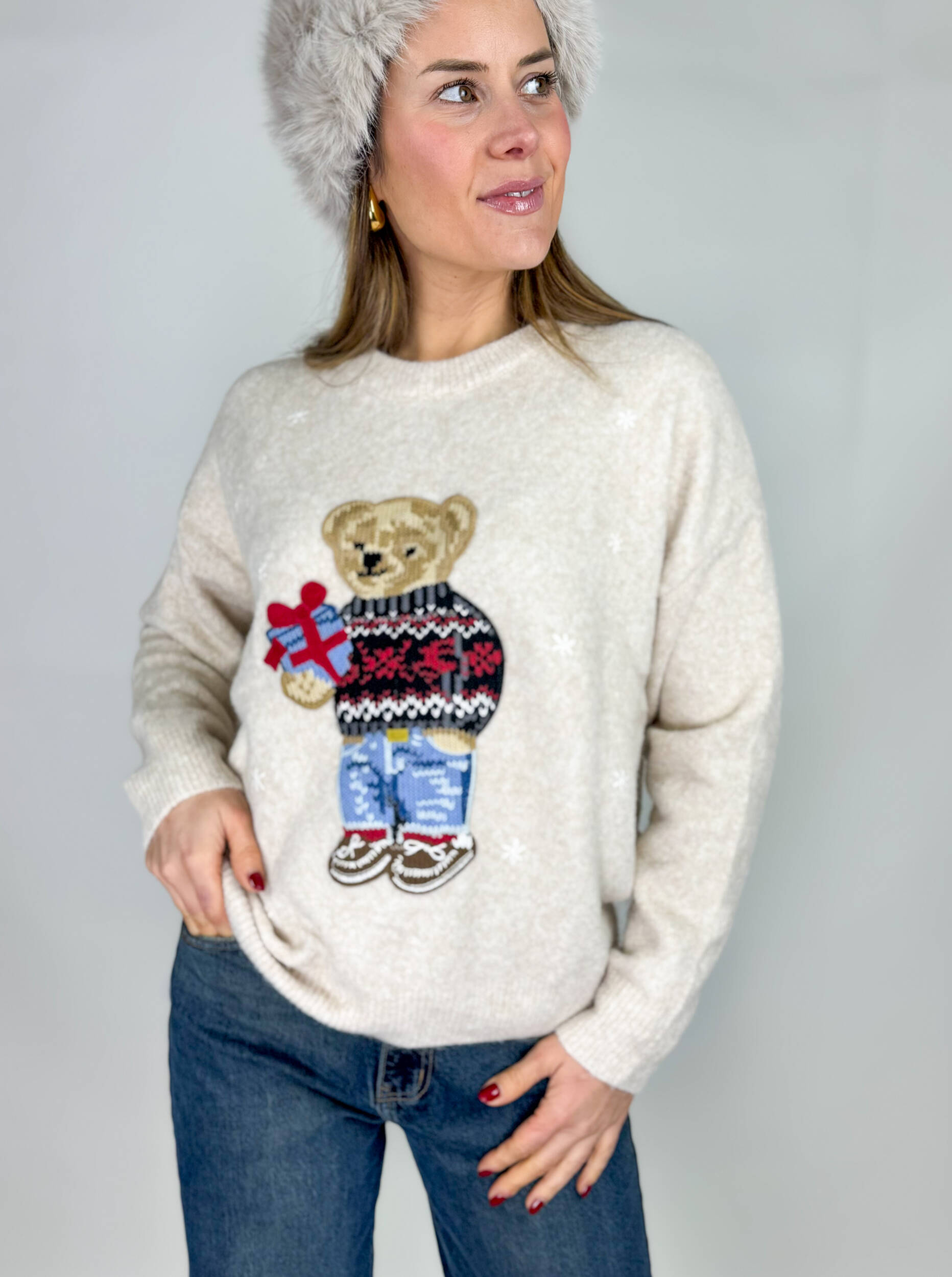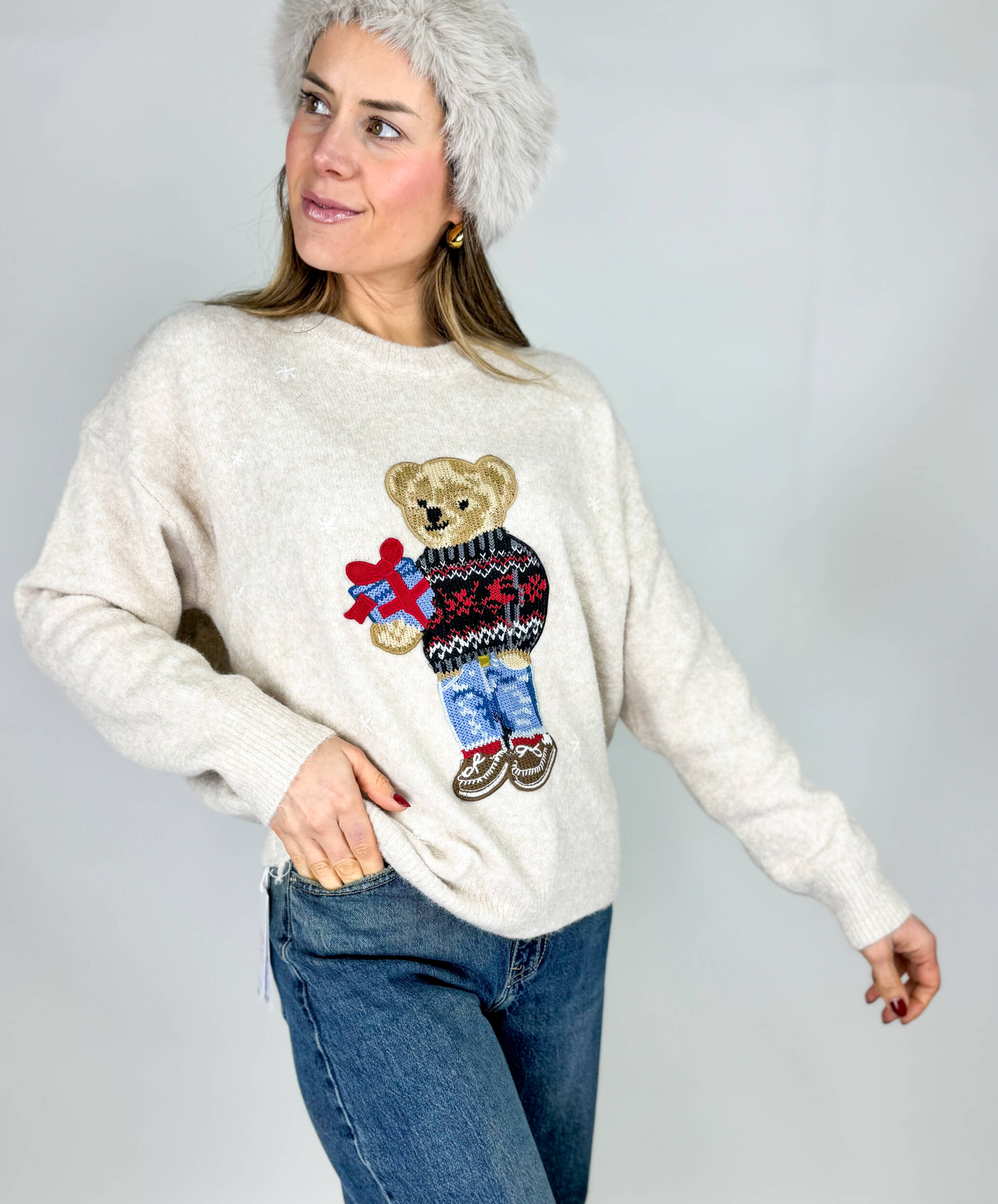 Pullover Teddy in morbida maglia invernale con orsetto ricamato sul davanti. Modello a girocollo.