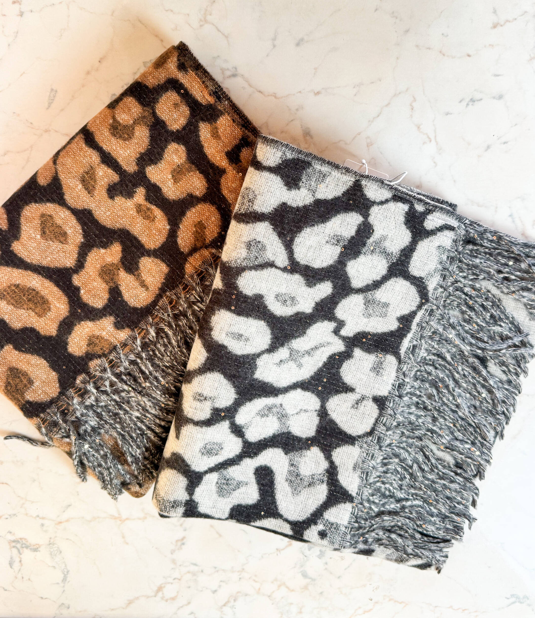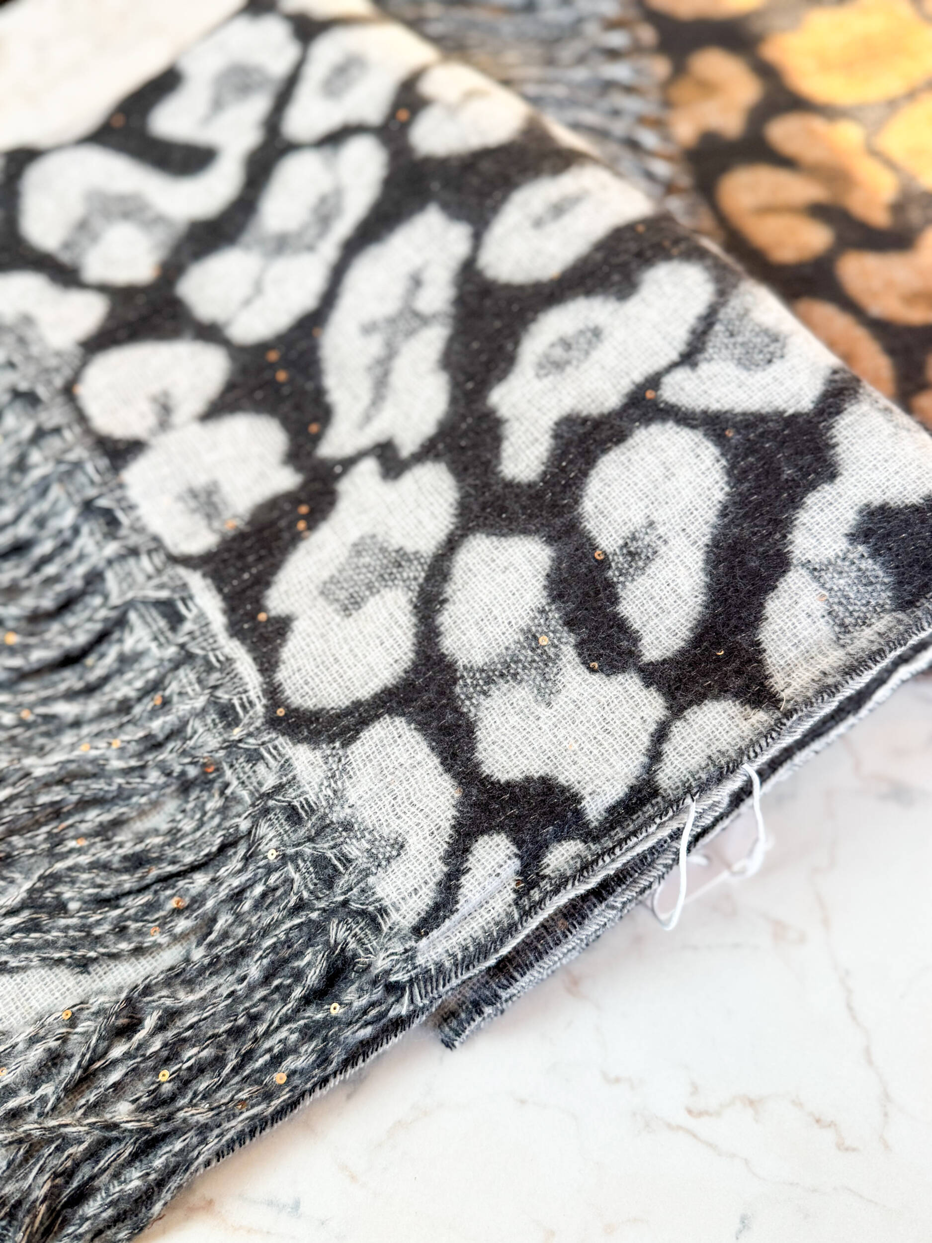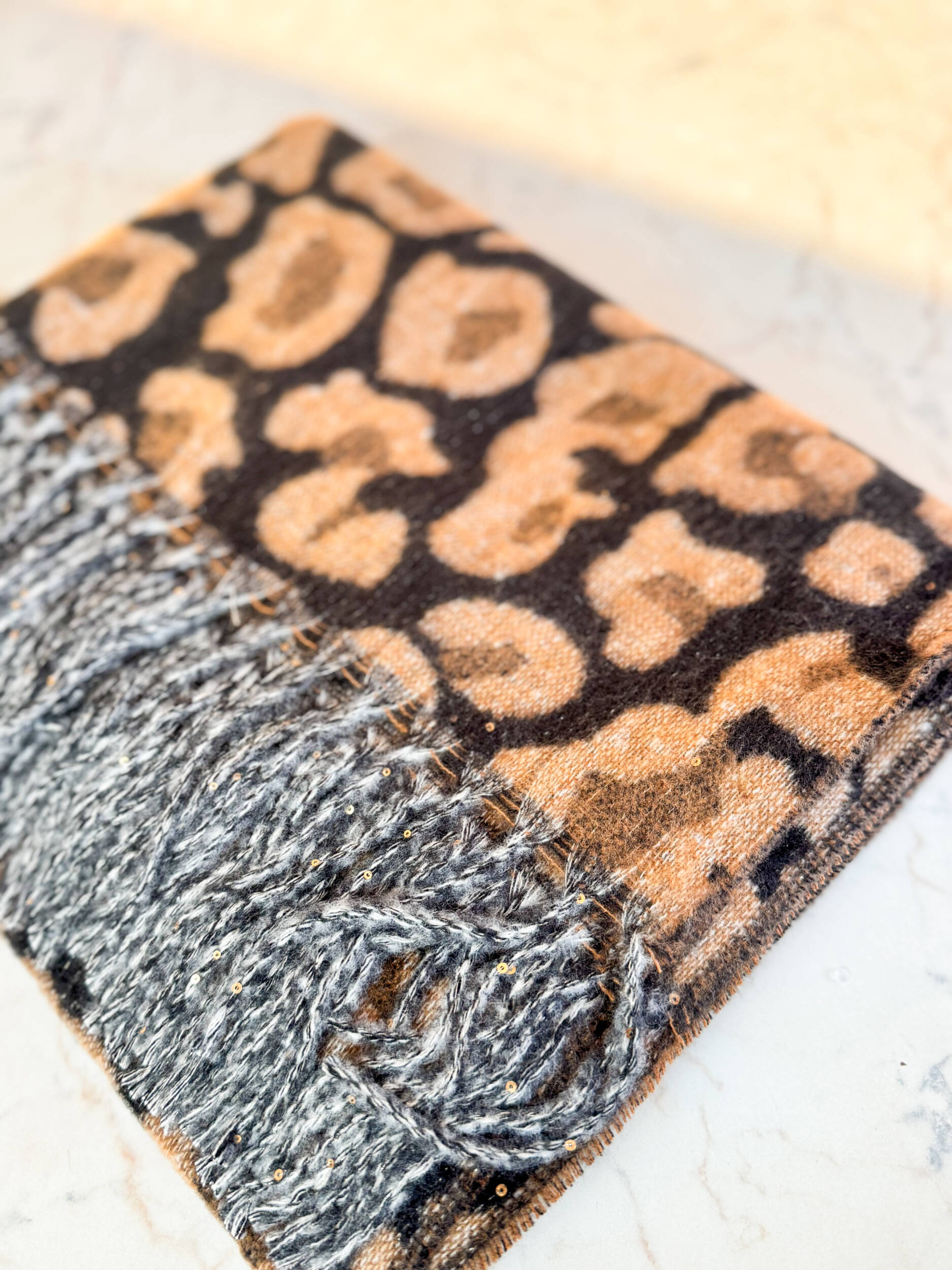 Sciarpa Zoe in calda maglia invernale, fantasia leopardata. Frange sugli orli e micropaillettes applicate.