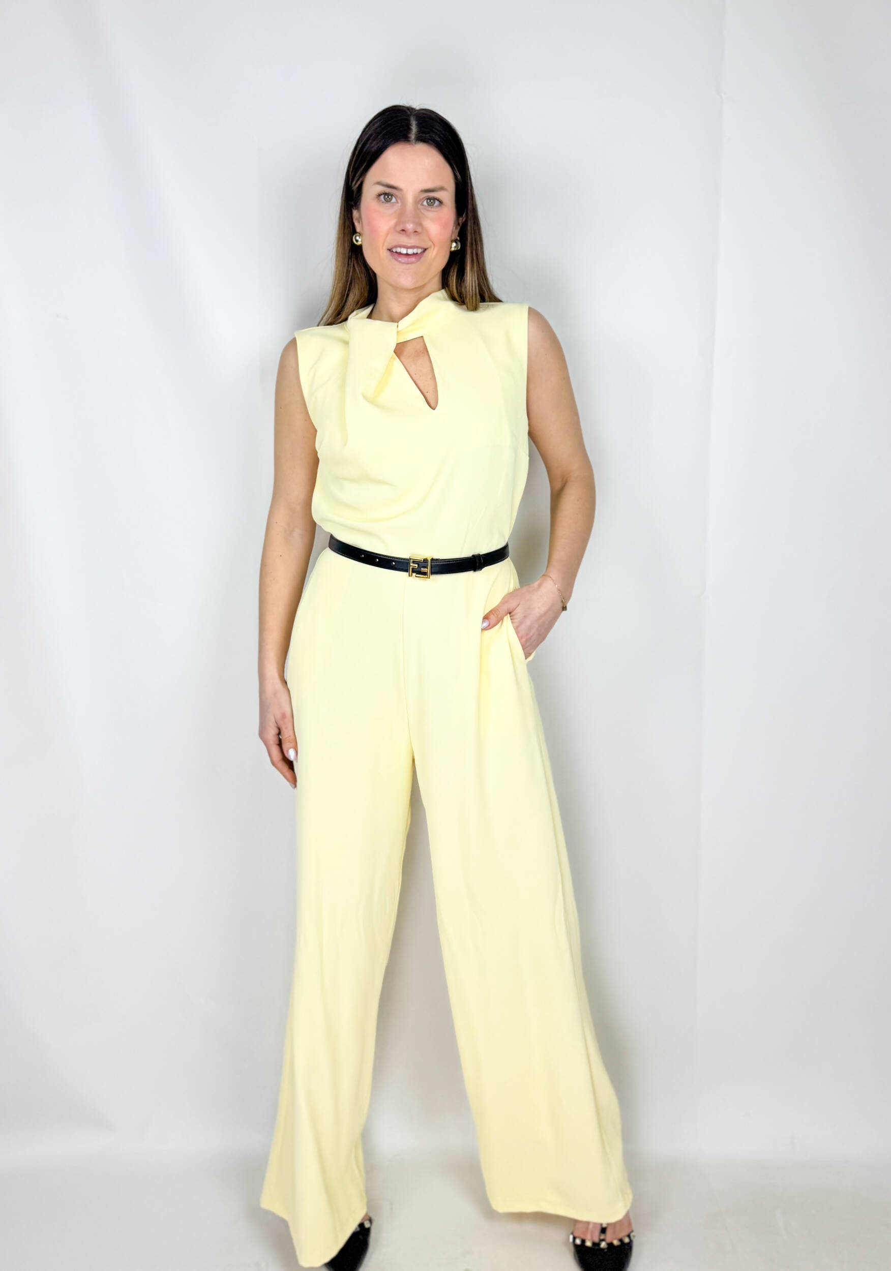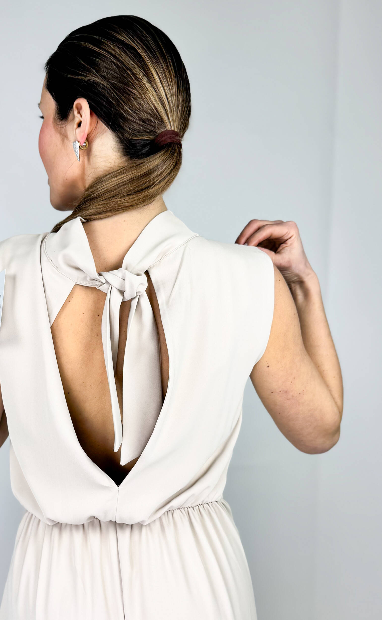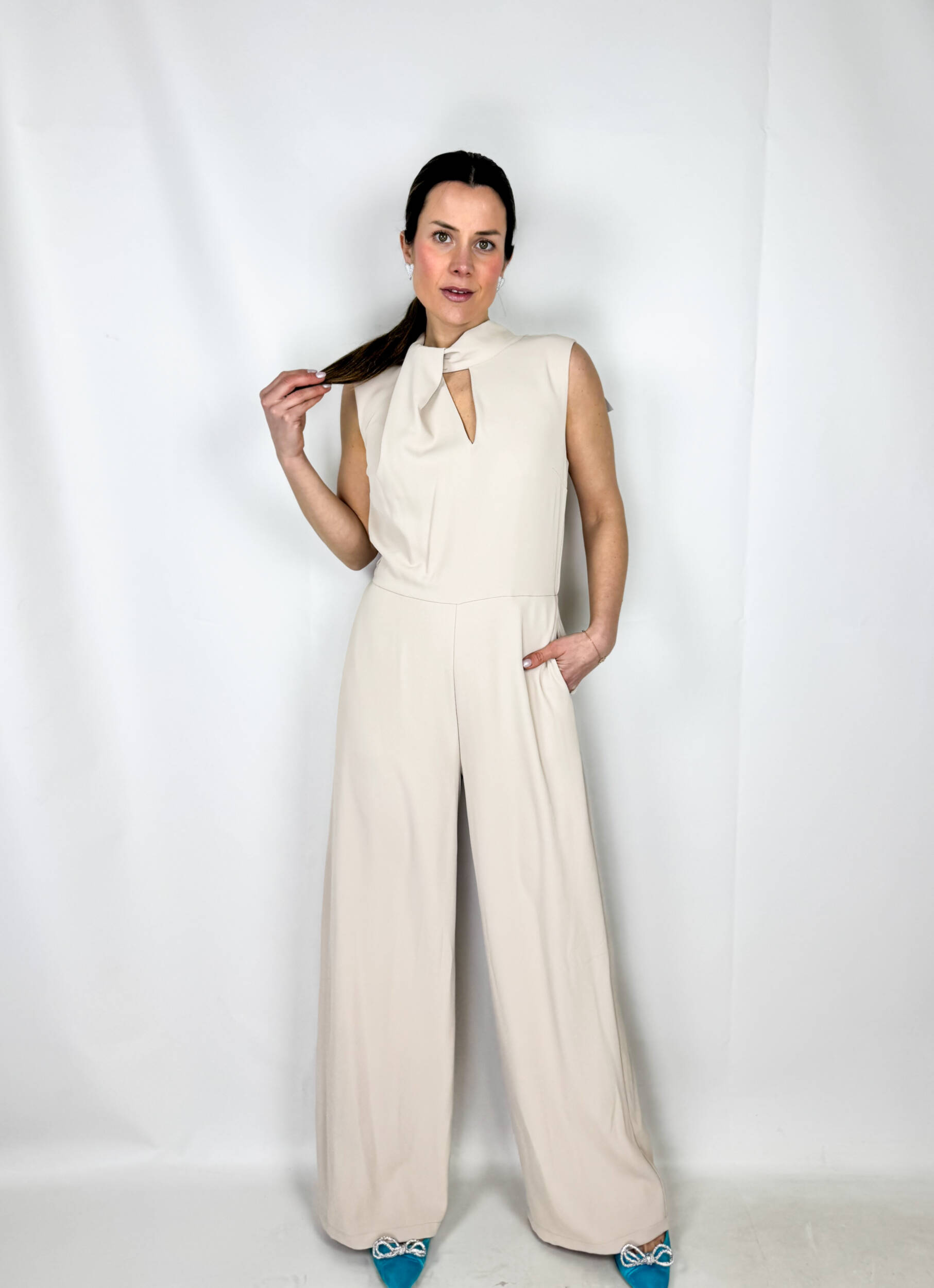 Tuta Roma intera smanicata dal design elegante e versatile, perfetta sia per una cerimonia che per un look casual con sneakers. Il dettaglio nodo sul collo aggiunge un tocco sofisticato e originale, valorizzando la parte superiore con stile. La linea fluida accompagna la silhouette con naturalezza, garantendo comfort e vestibilità impeccabile. Un capo chic e contemporaneo, facile da trasformare con gli accessori giusti. Scollo a goccia sulla schiena.