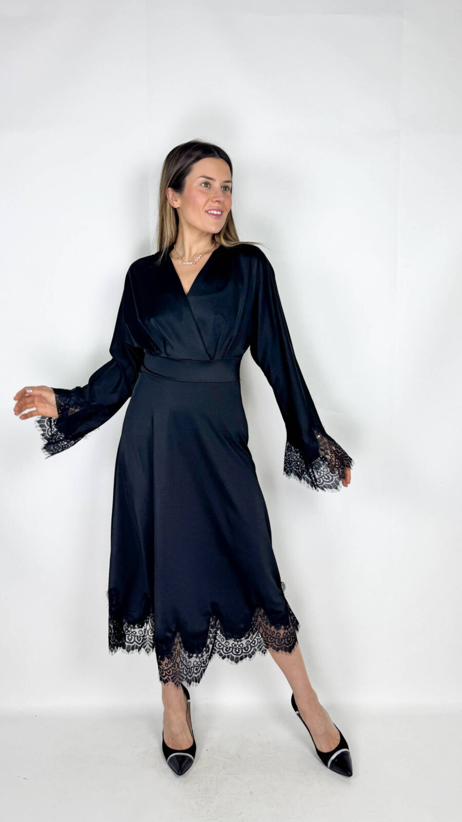 Vestito Marylin in pizzo bordeaux lungo alla caviglia. Sottoveste corta. Collo a lupetto. Apertura a goccia sulla schiena.