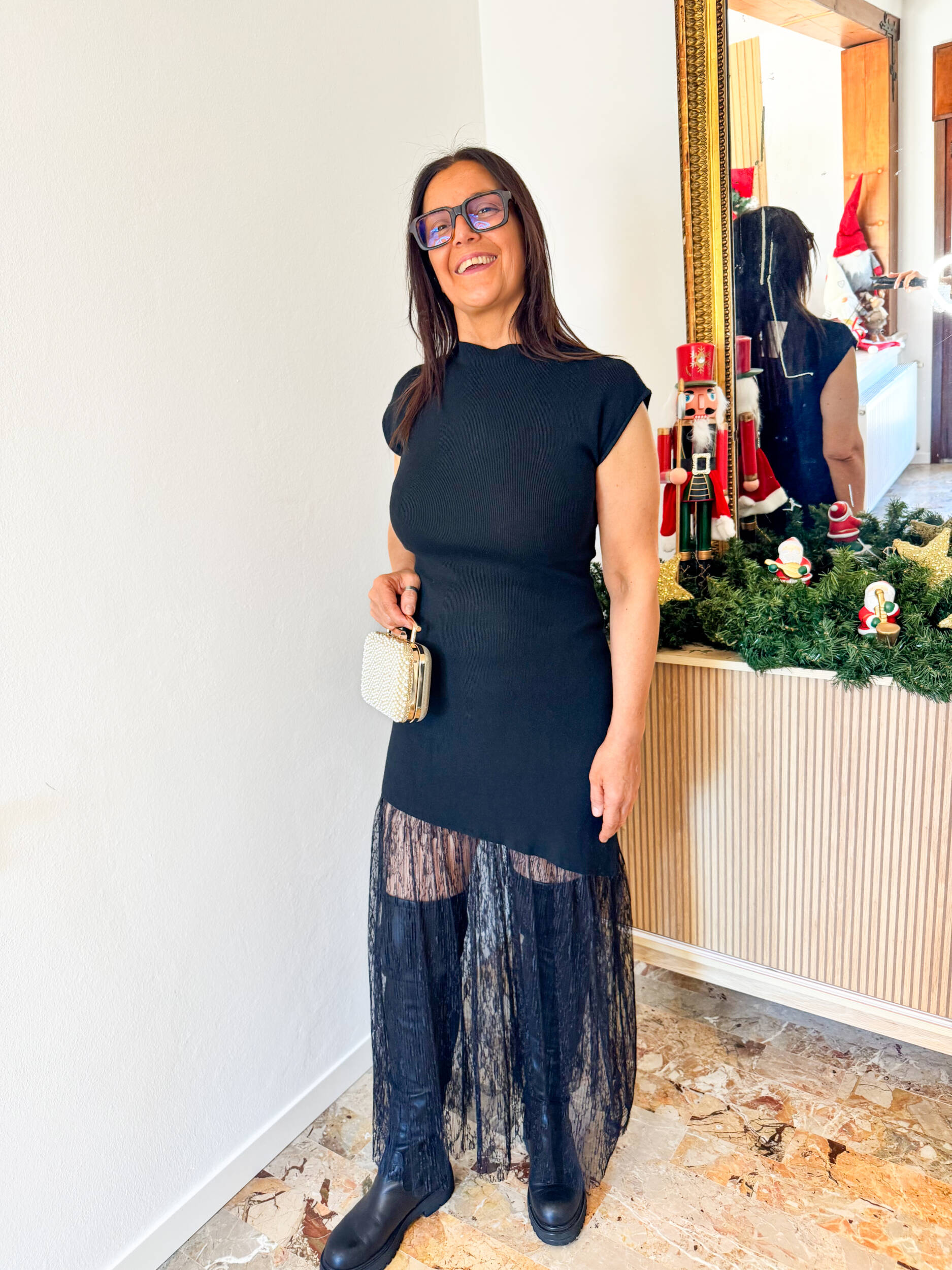 Vestito Night nero in morbida maglia a costine, asimmetrico, collo a lupetto e smanicato. Balza lunga in pizzo sul fondo.